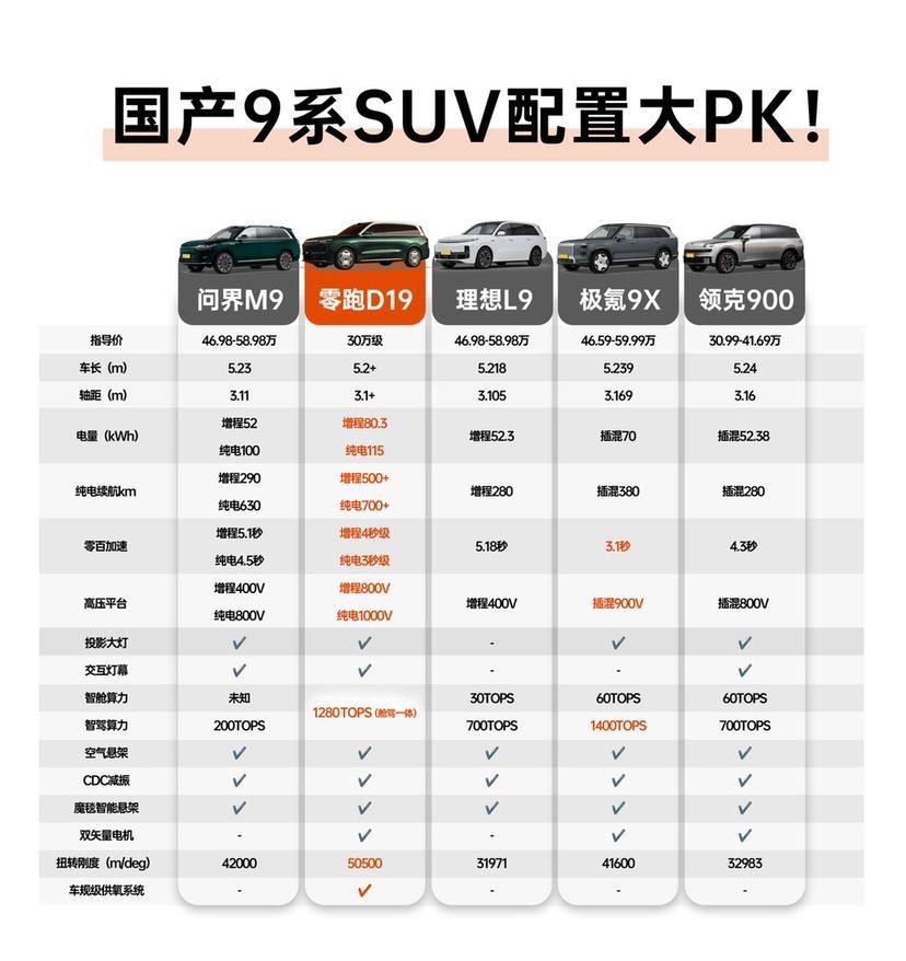 一半价格,平替9系? 最近想买台全尺寸SUV,但预算就30万左右,本来挺纠结的。 看到这张9系配置对比图,我发现零跑D19的配置确实还挺给力。尺寸和M9、L9差不多,但续航更长,充电更快,加速也猛。辅助驾驶目前看下来还行,甚至比9系其他车的配置还给力。说实话,本来想退而求其次,看看中大型的车型了,D19这一出来,感觉可以蹲蹲正式价格了【来自懂车帝车友圈】