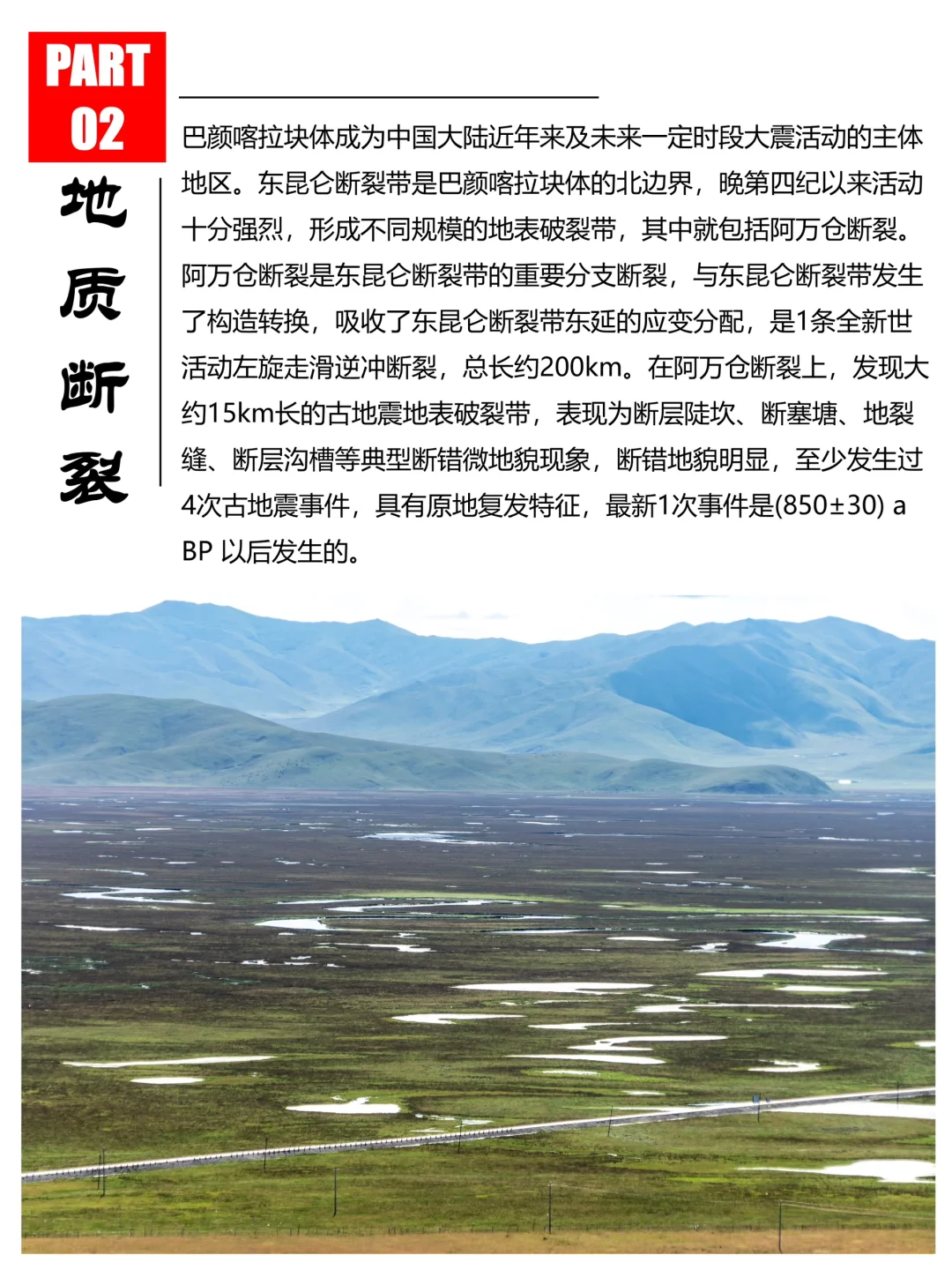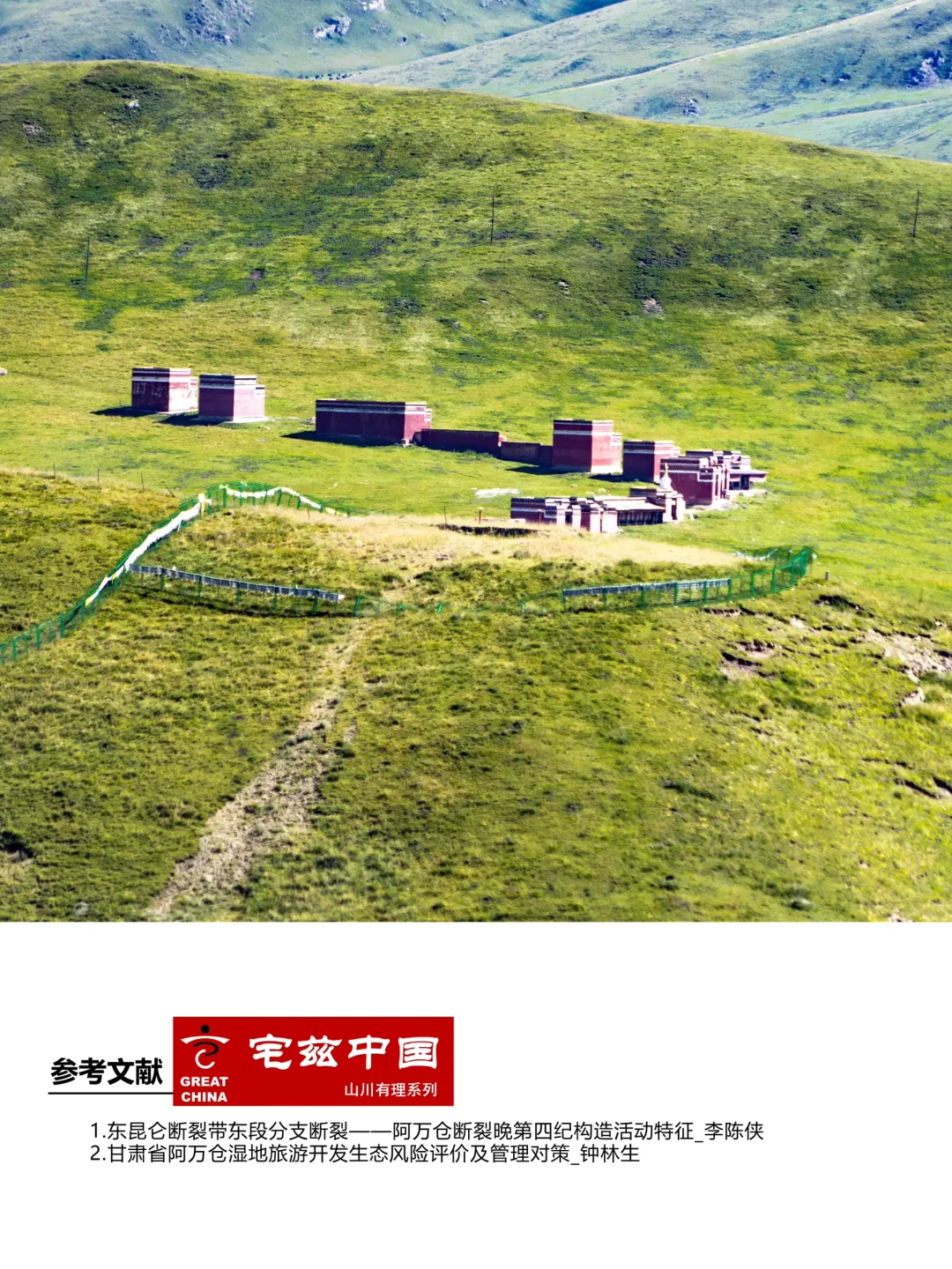 阿万仓湿地面积约200平方千米,地势西北高、东南低,海拔在3400-3700m之间,是典型的青藏高原东端高寒湿地类型区,主要包括河流湿地和沼泽湿地等类型。阿万仓湿地又称贡赛尔喀木道,藏语意为贡曲、赛尔曲、道吉曲三条河流与黄河汇流之地,因水泻不畅造就汊河与沼泽交织的独特地貌,是黄河上游重要水源涵养区。阿万仓断裂是东昆仑断裂带重要分支,是1条全新世活动左旋走滑逆冲断裂。