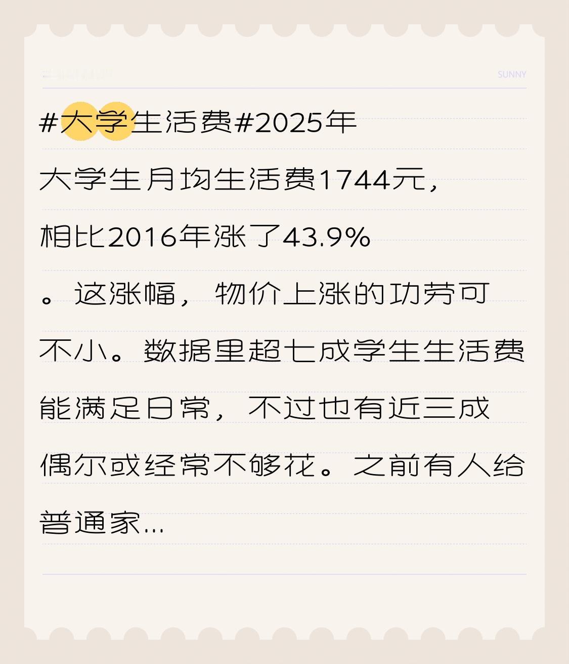 之前有人给普通家庭算过账,吃饭一个月1200,水电费人均100,通讯费50,洗澡费150,这就1500了,再加上同学聚餐、买资料等杂费,1800块比较合适。 我觉得这标准还蛮实在的,对大学生来说,有了这笔钱,只要不瞎挥霍,生活还是能过得有滋有味。也提醒咱得珍惜,毕竟钱都来之不易。
