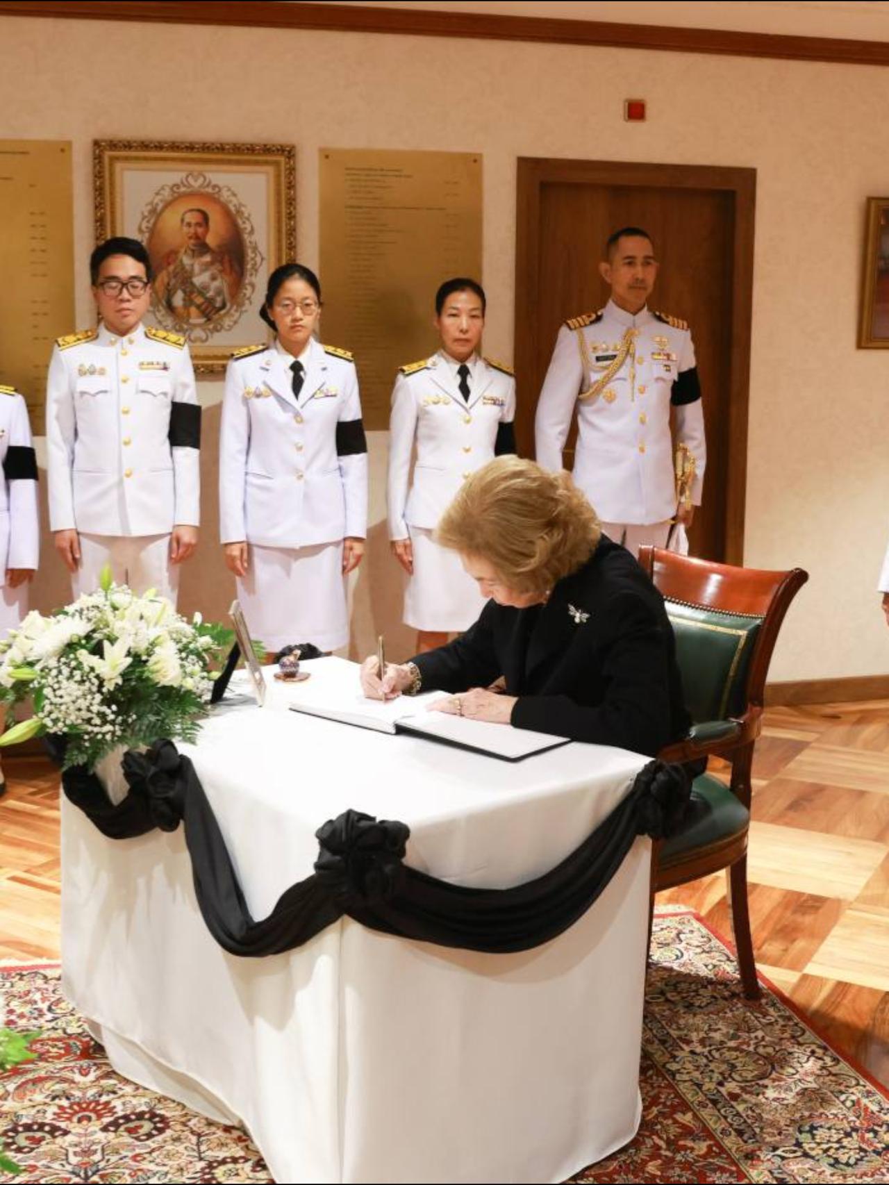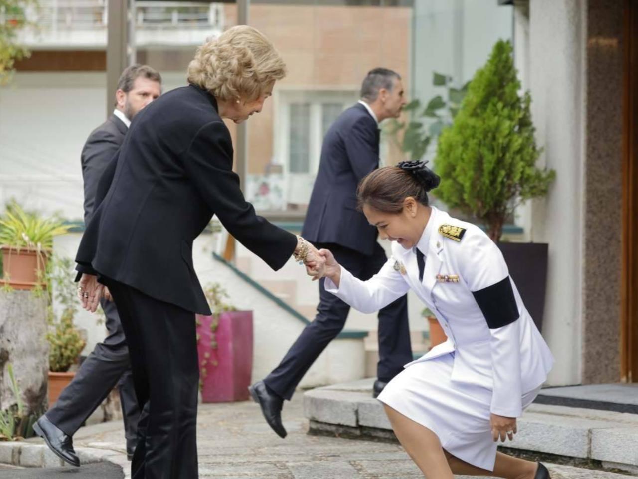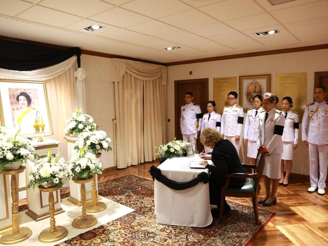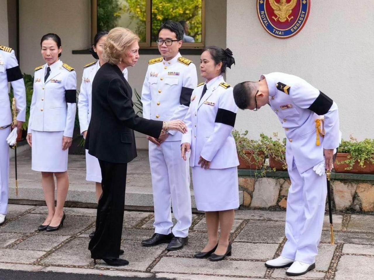 西班牙太后出席国葬,悼念诗丽吉太后 西班牙索菲亚太后,前往泰国驻马德里大使馆,在吊唁簿上签名,沉痛悼念已故泰国诗丽吉王太后,期间受到临时代办苏帕玛斯·尤尼亚西的热情接待。诗丽吉王后与索菲亚王后情谊深厚,长期友好,多次展开私人与正式层面的互访交流。