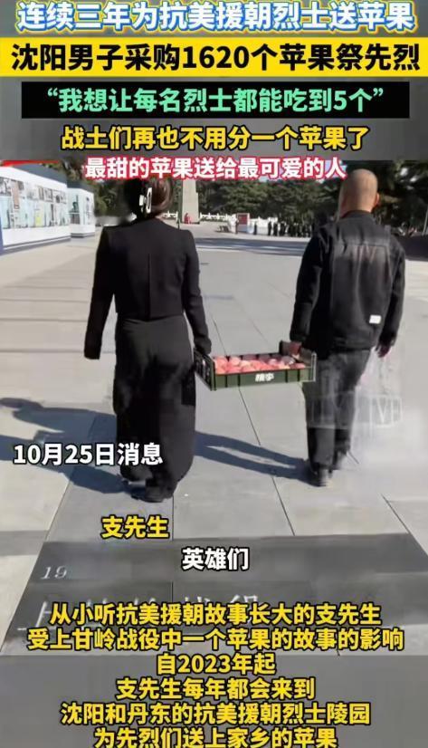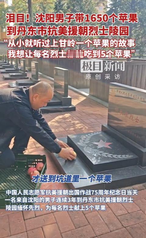 一大早就被感动哭了!10月25日,沈阳,一名47岁男子带着1650个苹果来到丹东烈士陵园,然后在每个墓碑前放上5个苹果,就为了圆一个藏在心底多年的念想——当年上甘岭的战士们,8个人才分得一个苹果,而现在,他要让每一位烈士都能吃上5个! 10月25日,沈阳47岁的支先生,开着车拉了整整1650个苹果,一路奔向丹东抗美援朝烈士陵园,车里的苹果个个又大又红,在阳光下泛着诱人的光泽。 到了陵园支先生没搞什么仪式,就是默默地把苹果一箱箱搬下来,然后开始了他的任务给每个墓碑前摆上5个苹果,330个墓碑1650个苹果刚好每位烈士5个。 支先生这么做是因为从小他就深受课本上《一个苹果的故事》的感动,当时1952年10月上甘岭战役打得非常惨烈,美军的炮火把山头都削平了,志愿军战士们躲在坑道里死守阵地。 最要命的是敌人封锁了所有补给线,送上去一车物资,可能要牺牲好几个战士,坑道里的战士们渴得嘴唇干裂喉咙冒烟,连口水都成了奢望。 就在这种绝境下,一个苹果奇迹般地送到了七连连长张计发的坑道里,当时坑道里只剩8个战士了,这个苹果对他们来说,那就是救命的甘露啊。 可您猜怎么着,这个苹果在8个人手里传了一圈又一圈,愣是没人舍得先咬一口,每个人都想着让给战友,让给更需要的人,最后还是连长下了命令,把苹果切成8份,每人才吃了那么一小口。 这个故事后来被写进了课本,感动了一代又一代人,支先生就是听着这个故事长大的,每次听到这儿,他心里就特别不是滋味。 现在咱们日子好了,超市里苹果堆成山,想吃多少有多少,可那些为了今天的好日子献出生命的英雄们,却再也尝不到了。 前年开始支先生就下定决心要做这件事,每年都要带着最好的苹果,先去沈阳的烈士陵园再去丹东,今年10月25日他又来了。 陵园里静悄悄的只有风吹过松柏的声音,支先生一个墓碑一个墓碑地走过去弯下腰,轻轻地把5个苹果摆在墓前,嘴里还念叨着:英雄,现在苹果管够了,您多吃几个。 其实啊支先生这个举动背后还有更深的含义,当年志愿军出国作战,装备差补给难,硬是凭着一股子精神打赢了,现在咱们国家强大了,物资丰富了可这份精神不能丢。 丹东这个地方也特殊,当年志愿军就是从这里跨过鸭绿江的,现在江对岸高楼林立江这边青山依旧,时代变了可英雄们的精神永远都在。 支先生的故事传开后不少人都被感动了,还有学校组织学生来参观,正好碰上支先生在摆苹果,老师就地给孩子们上了一堂生动的爱国主义教育课,孩子们听完一个苹果的故事,看着墓前的5个苹果,好多都哭了。 这事儿让人想起一句话:岁月静好,是因为有人替你负重前行,咱们今天能安安稳稳地过日子,能想吃啥就吃啥,都是因为有这些英雄在最艰难的时候挺身而出。 支先生用最朴实的方式提醒着每一个人,别忘了咱们的好日子是怎么来的,这1650个苹果,不仅是对英雄的告慰,更是对活着的人的警醒。 山河已无恙英雄当品尝,这份跨越时空的温情,让人看到了什么叫真正的不忘初心。 麻烦看官老爷们右上角点击一下“关注”,既方便您进行讨论和分享,又能给您带来不一样的参与感,感谢您的支持!