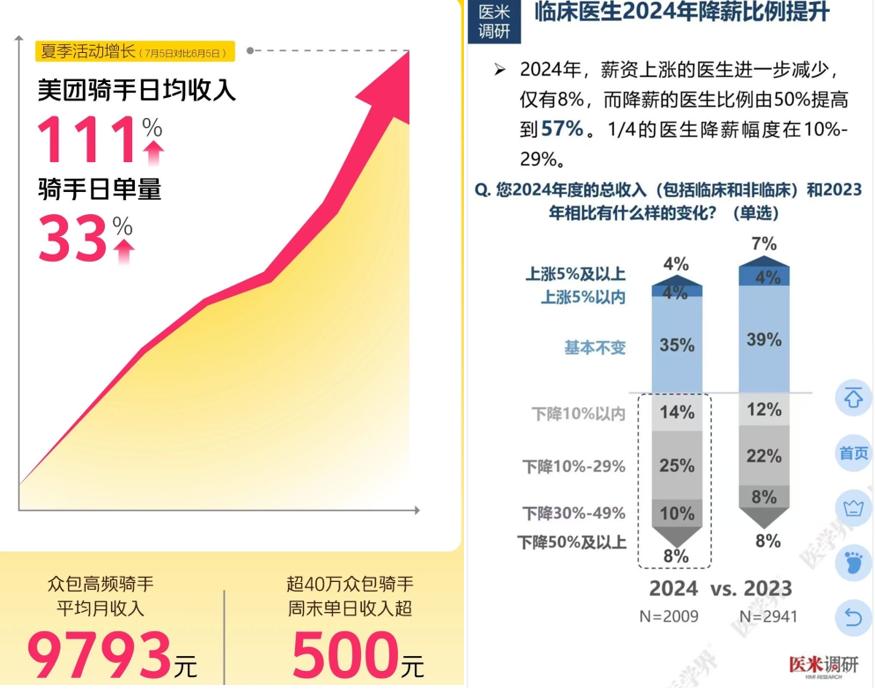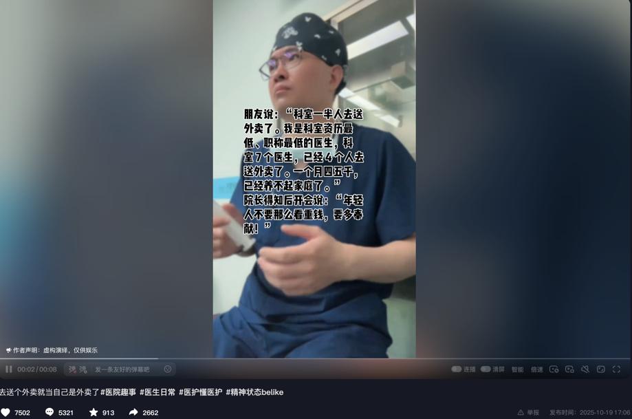 医生科室一半人都跑去送外卖?说真的,如今的外卖行业,真和大伙印象中不太一样了! 最近在网上看到这么个视频,一个医生的朋友吐槽自己科室一半的人都去送外卖了,而且还都是比自己资历和职称要高的。因为一个月四五千的工资实在供不起一家人的开支了,这也是没有办法的办法。 结果院长开完会说:“年轻人不要那么看重钱,要多奉献”,真是把饱汉不知饿汉饥这句话诠释的淋漓尽致。其实客观来说,现在不光是医生,很多行业都有不少人将骑手作为了自己的副业。问起原因,有人的回答就两个字“踏实”。甚至前段时间还有个热门话题,就叫“送了外卖以后,差点忘了自己以前是干什么的了”,几乎涵盖了各行各业的工作者。 大家选择这个行业的理由也是五花八门,但最根本的还是因为外卖这行真能挣到钱。直接上数据,就拿美团来说,6月份,全国众包高频骑手的月均收入已经达到了9793元。都快是不少医生的2倍了,真不怪人家科室的医生都跑去送外卖。而对比之下,医生这边的整体薪资却在连年下降。 甚至,美团最近还直接给全国的骑手都交上了社保,不管全职还是众包都能拿到。这方案虽然算不得多好,但确实是行业里头一个给所有骑手都安排社保的平台了。不少骑手兄弟都已经领了几个月的社保补贴了,每个月四五百,不多,但也够补贴家用。 要我说啊,甭管是做医生还是跑外卖,都是靠自己双手赚得钱,你可以说跑外卖很累,但挣钱,绝对没什么丢人的。更何况外卖行业如今也在不断进步,咱们自己观念也得跟着进步,否则真可能要落后于时代了。