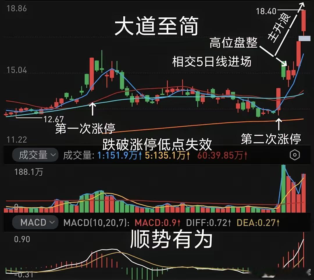 选股方法:把每天符合主升浪模型的涨停板股票加入自选,每天盘前盘后看两遍,寻找高位盘整不破高的和下跌回调企稳出现拐点信号的这两种情形。