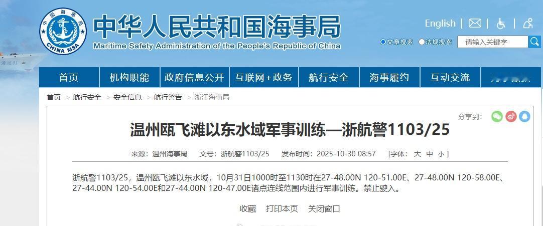 【航行警告!温州瓯飞滩以东水域军事训练】据中国海事局网站消息,温州海事局发布航行警告,10月31日10时至11时30分,温州瓯飞滩以东水域进行军事训练,禁止驶入。军报快讯 (中国海事局网站)