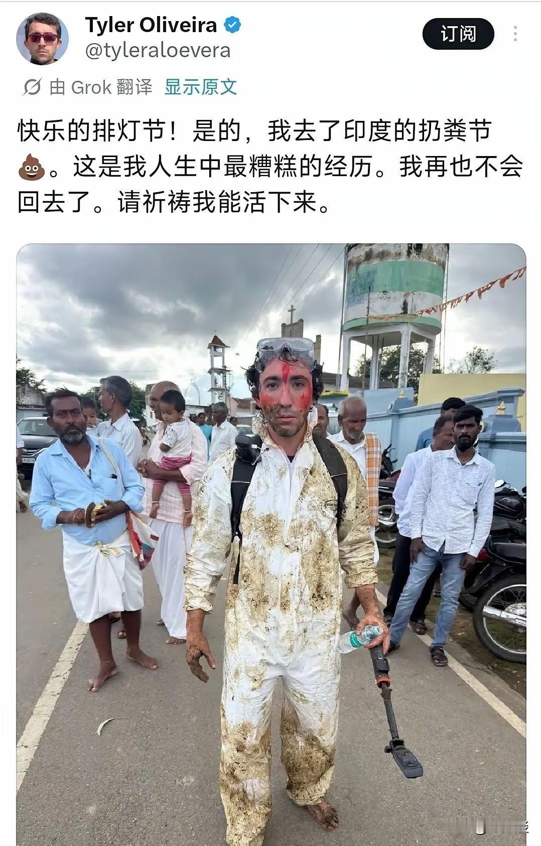外国网友到印度参加泼粪节,弄得全身都是黄黄的大便,大粪你涂过来,我扔过去,大家玩得不亦乐乎!他是真有勇气参加这样的节日庆典!印度泼粪节的大粪到底是人粪还是动物排泄物呢?不论什么,不过有网友说了,印度吃的主要是青菜,所以大粪也不会特别有气味,而且还是青草香香,想想这个画面,真是让人回味!看这位外国网友其实也没有特别排斥,还是享受其中的,虽然刚从粪坑里爬起来。