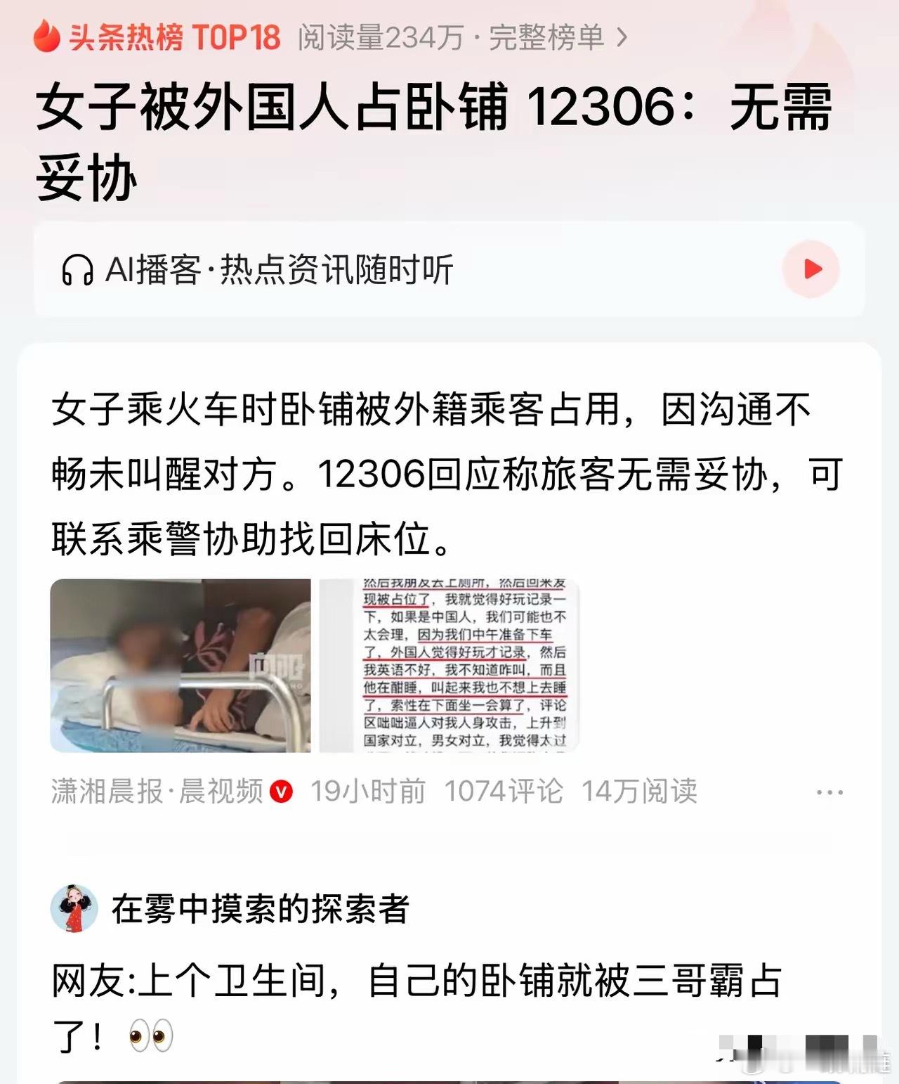 女子被外国人占卧铺 12306:无需妥协