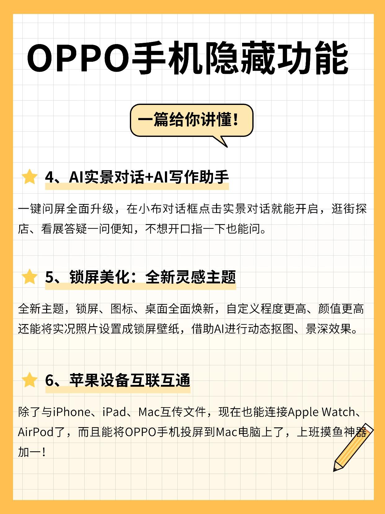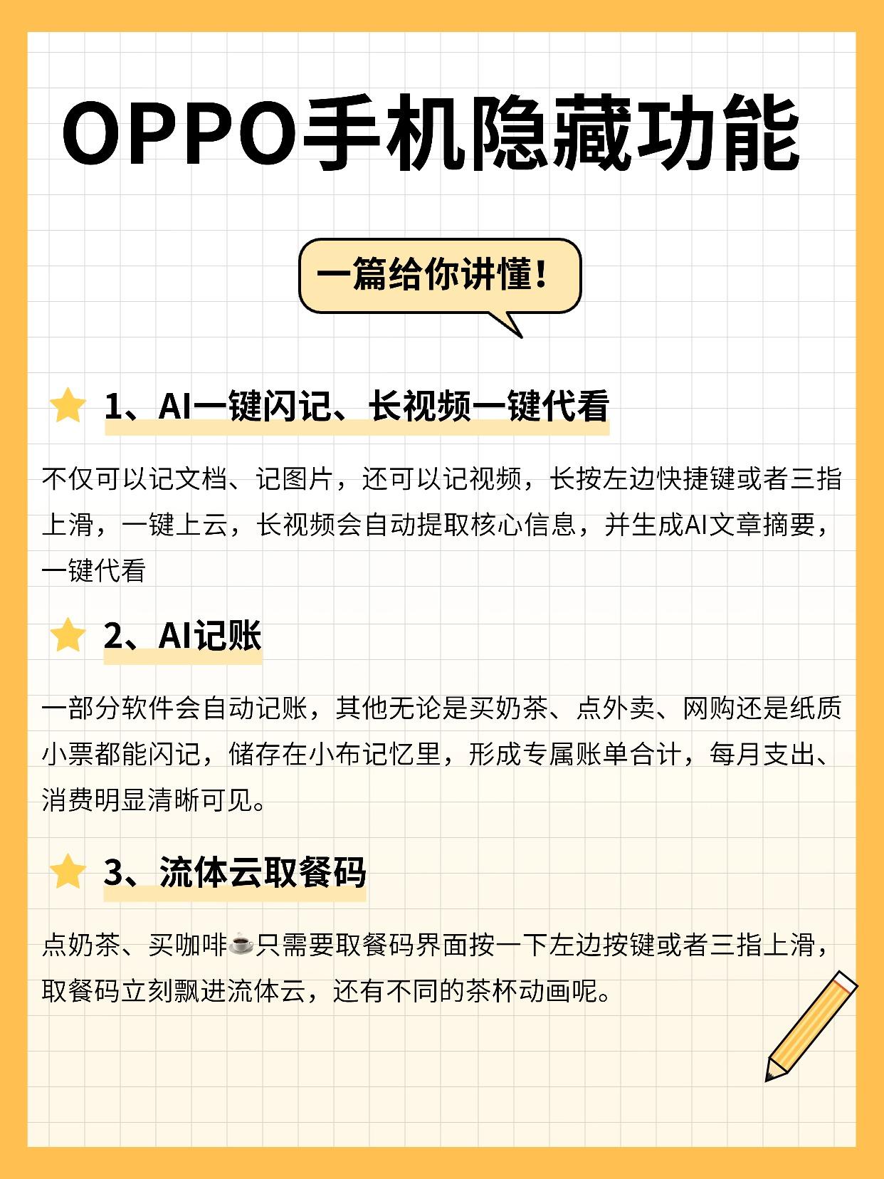 OPPO你有这么多隐藏功能不早说!还是专属的 姐妹们, 我们手里的OPPO手机还是被严重低估了,特别是现在ColorOS16系统一来,有好多官方没咋宣传的功能,一用就回不去,真香~ 1、AI一键闪记、长视频一键代看 2、AI记账 3、流体云取餐码 4、AI实景对话 5、锁屏美化:全新灵感主题,实况动态景深锁屏效果 6、苹果设备互联互通 - 目前ColorOS16正式版已经开始推送了,11月左右能更新的有OPPO Find X8系列、OPPO Reno14系列、OPPO Find N5系列等等,如果你想低成本体验ColorOS16的话,现在双11许多OPPO手机很香。 - 比如OPPO Find X8,已经不到三千💰了,6.59英寸黄金尺寸,轻薄好手感的同时哈苏影像、天玑9400、满级防水等配置超能打,同价位难有对手。 - 还有Find X8s,三千出头的6.3英寸小屏旗舰,有领先同价位的哈苏三摄、天玑9400+旗舰芯片,拍照和性能非常强,适合喜欢小屏的用户,最后就是OPPO Reno14 Pro,超高颜值大屏手机,同时有5000万像素长焦,人像、live实况照片非常出片,还是不错的直播手机呢,感兴趣的不妨看看。 - 手机功能 玩机技巧 手机分享 OPPO OPPOFindX8 OPPO双十一 OPPOReno14