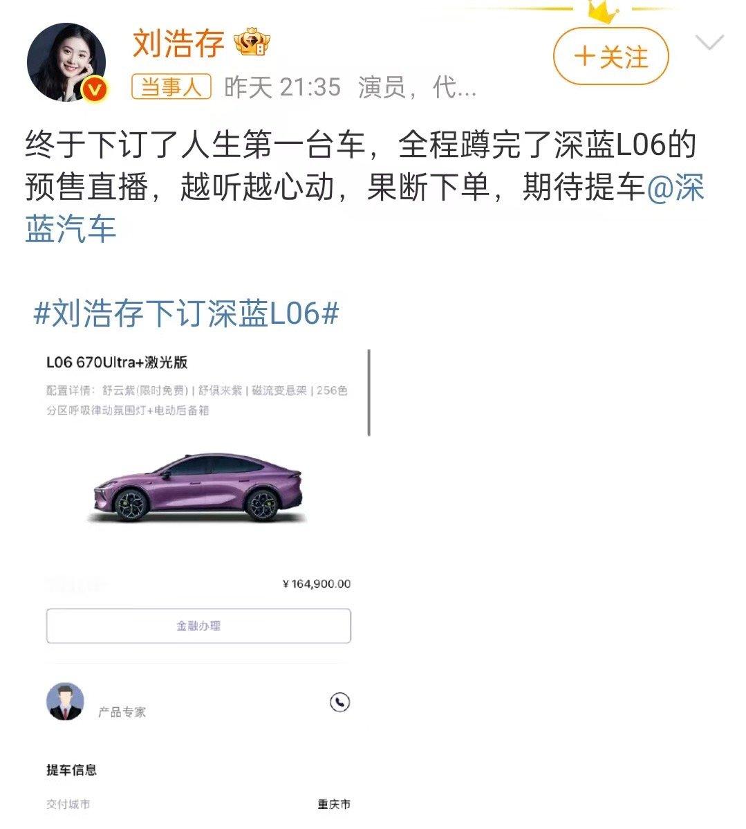 刘浩存晒新车订单深蓝L06用众多离谱造就超级靠谱