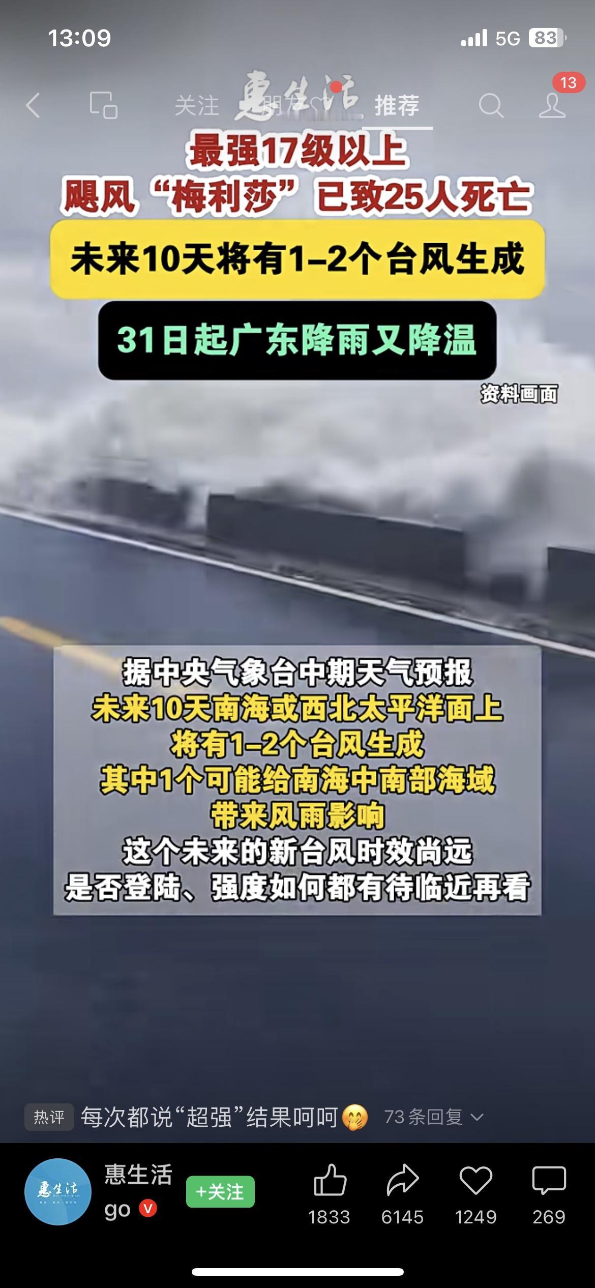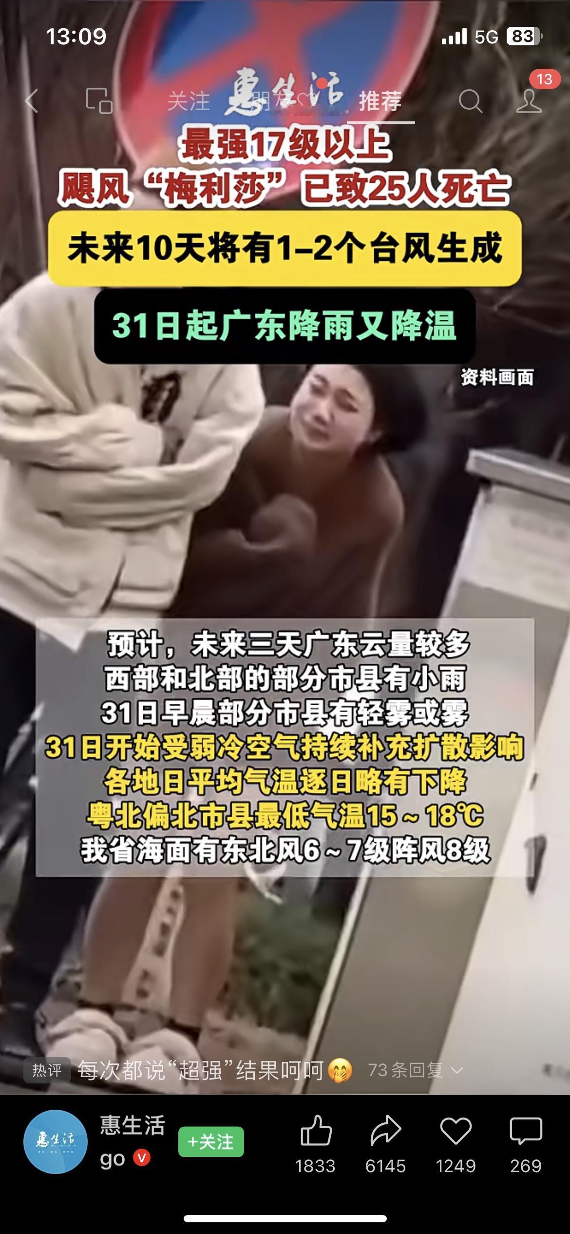 刚爆!17级“风王”杀25人,广东明起要冻哭? 刚刷到这消息腿都软!那17级的“全球风王”梅利莎,都搞没25个人了! 更离谱的是——未来10天还要冒1-2个台风!咱广东从31号开始,雨哗哗下+气温狂跌,粤北直接干到15℃!这前几天还穿短袖,明儿就得裹外套? 广东的兄弟姐妹们,厚衣服翻出来没?这天气跟闹着玩似的,你家现在是热还是已经凉透了?赶紧转给身边人,出门别被这“断崖降温”坑了!广东台风塔巴 广东台风塔巴
