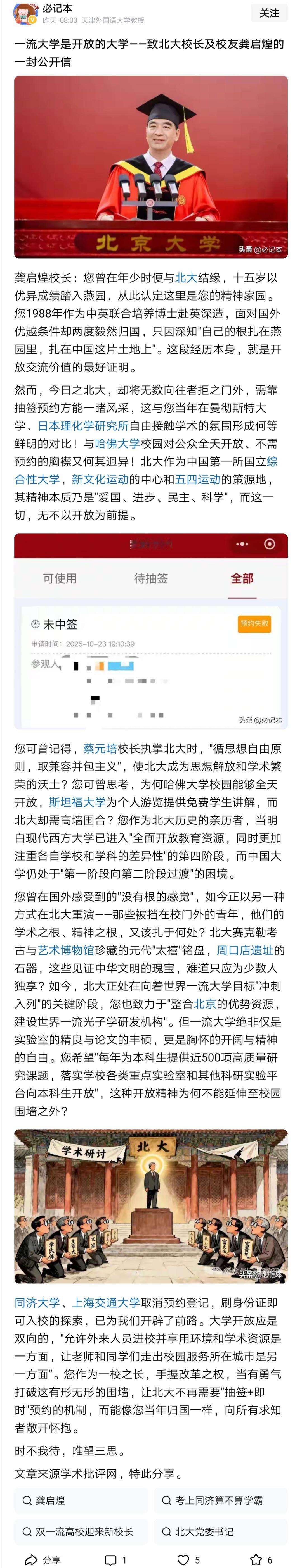 北大清华的开放,引人关注。能不能实现不设限的开放,破除有形的围墙? 有人说能 ,只要下定决心,就肯定能做到。开放最初进校人员可能很多,但形成开放机制后,就不会有那么多人了。 也有人反对,认为这是想当然。开放之后北大清华的教学秩序肯定会受到影响,毕竟大学首先要保障教学、科研,基本的教学秩序都保障不了,谈何不设限的开放。 真正值得思考的问题有二: 一是近年来越演越烈的清北崇拜,为何研学游一定要去清北?10多年前,都没有这么强烈的清北崇拜,现在,各地政府部门、重点高中都以清北率(考上北大清华的人数)作为重要升学政绩。 二是大学在学生、家长与公众眼里,成为无限责任主体,只要在校园里发生安全事故,必然追究校方责任。这也是近年来越来越显著的变化。以至于有的大学采取高中管理模式。