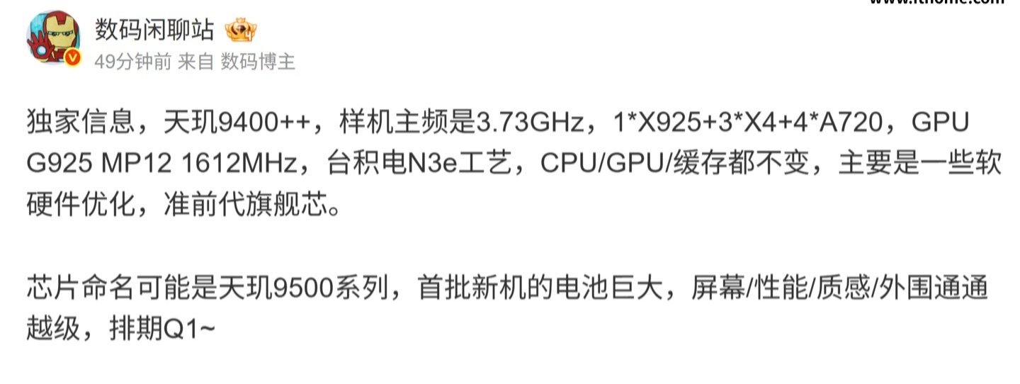 博主 数码闲聊站在微博发文,透露联发科天玑 9400++ 芯片的具体规格。