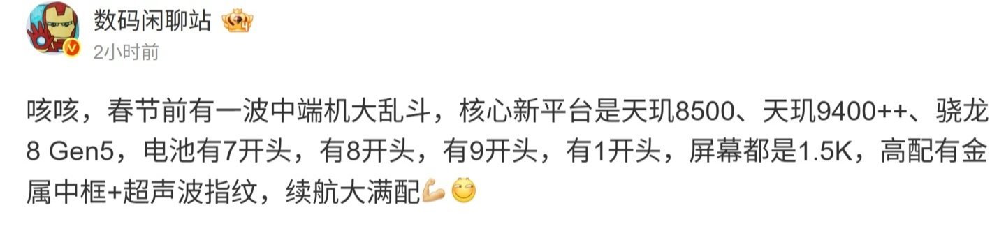 部分手机厂商将在春节前开启“中端机大乱斗”,核心平台有联发科天玑 8500、天玑 9400++,还有高通骁龙 8 Gen 5 等,电池容量有 7 开头、8 开头、9 开头,甚至还有“1 开头”,屏幕都是 1.5K 分辨率。