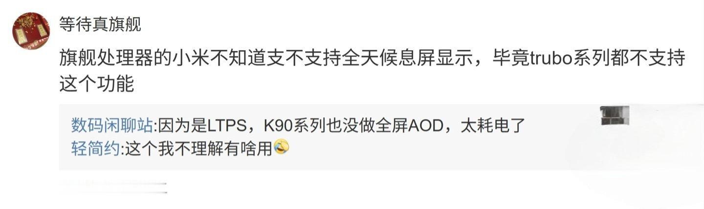 后续有用户在评论区询问:“旗舰处理器的小米不知道支不支持全天候息屏显示,毕竟 trubo 系列都不支持这个功能”,博主回复道:“因为是 LTPS,K90 系列也没做全屏 AOD,太耗电了”。