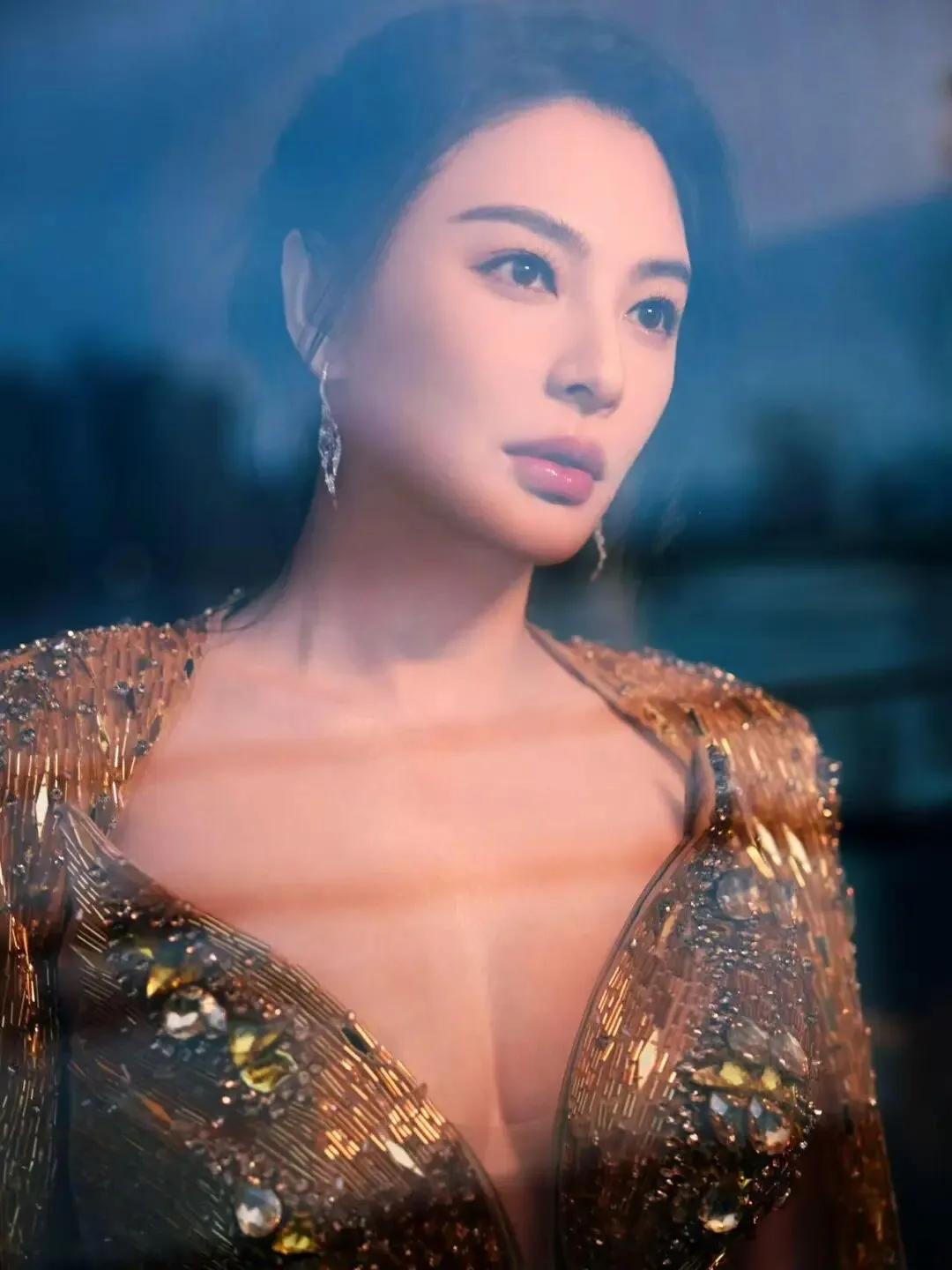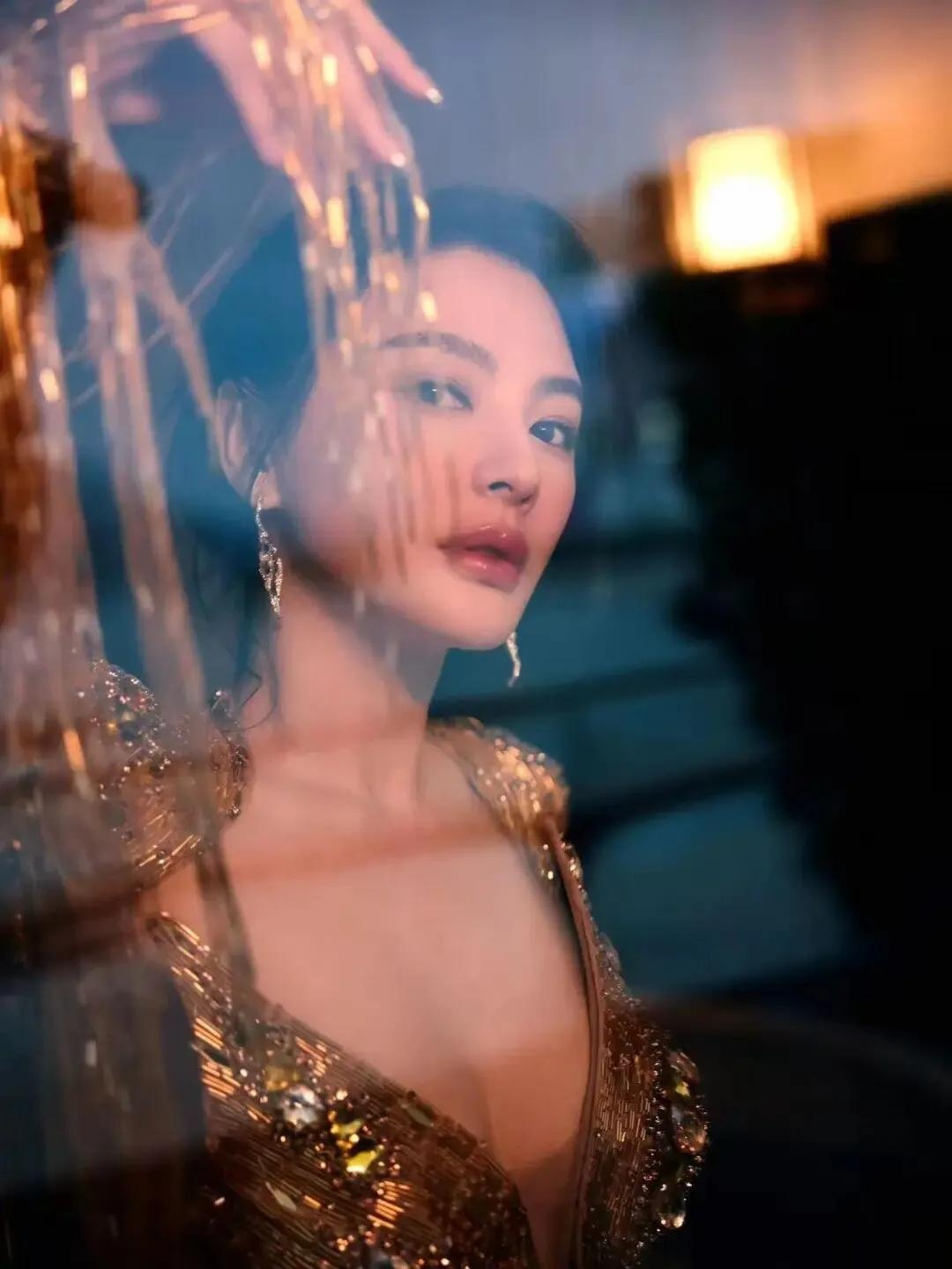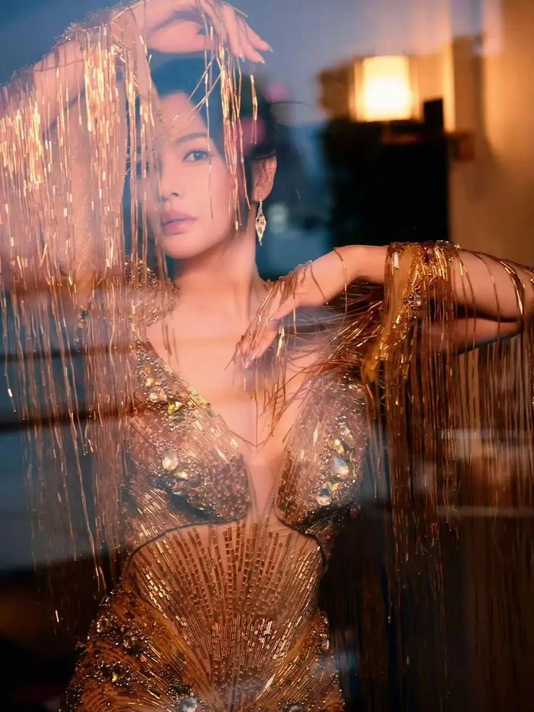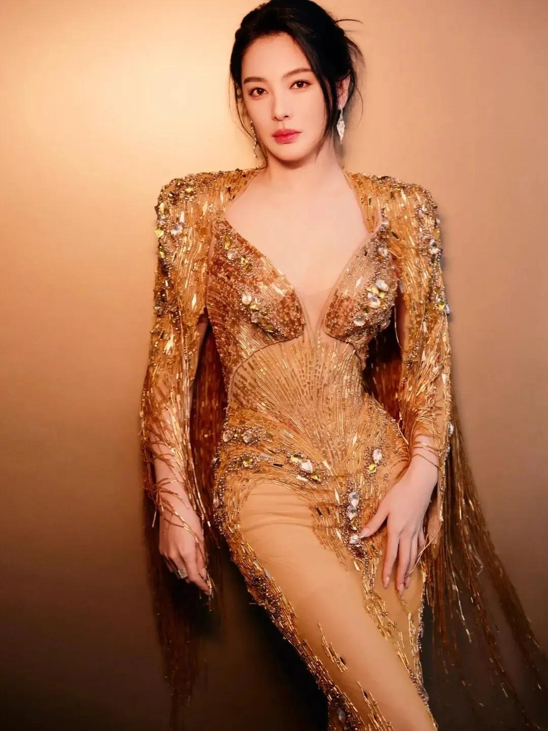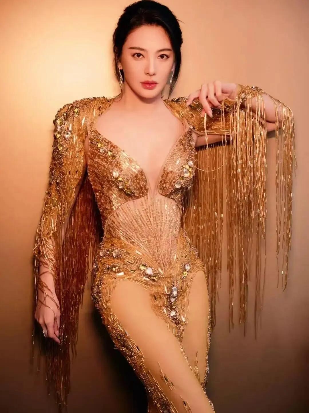 张雨绮这身黄金战衣,设计大胆又高级,保证90%的人没欣赏过。 深V领口延伸至腰线,完美展现优越肩颈线和迷人锁骨,勾勒出成熟丰腴的身材曲线。 战衣融入透视元素,腰侧、臂弯处的薄纱若隐若现,打破纯色沉闷,增添神秘感。立体剪裁贴合身体起伏,精准呈现沙漏型身材。手臂与肩部的流线型设计,修饰线条的同时,赋予造型强大气场,尽显女王威严。张雨绮