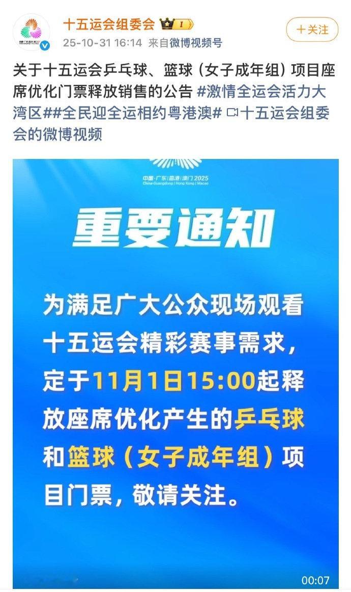 十五运乒乓球二次开票 据十五运官微:为满足广大公众现场观看十五运会精彩赛事需求,定于11月1日15:00起释放座席优化产生的乒乓球和篮球(女子成年组)项目门票,敬请关注。