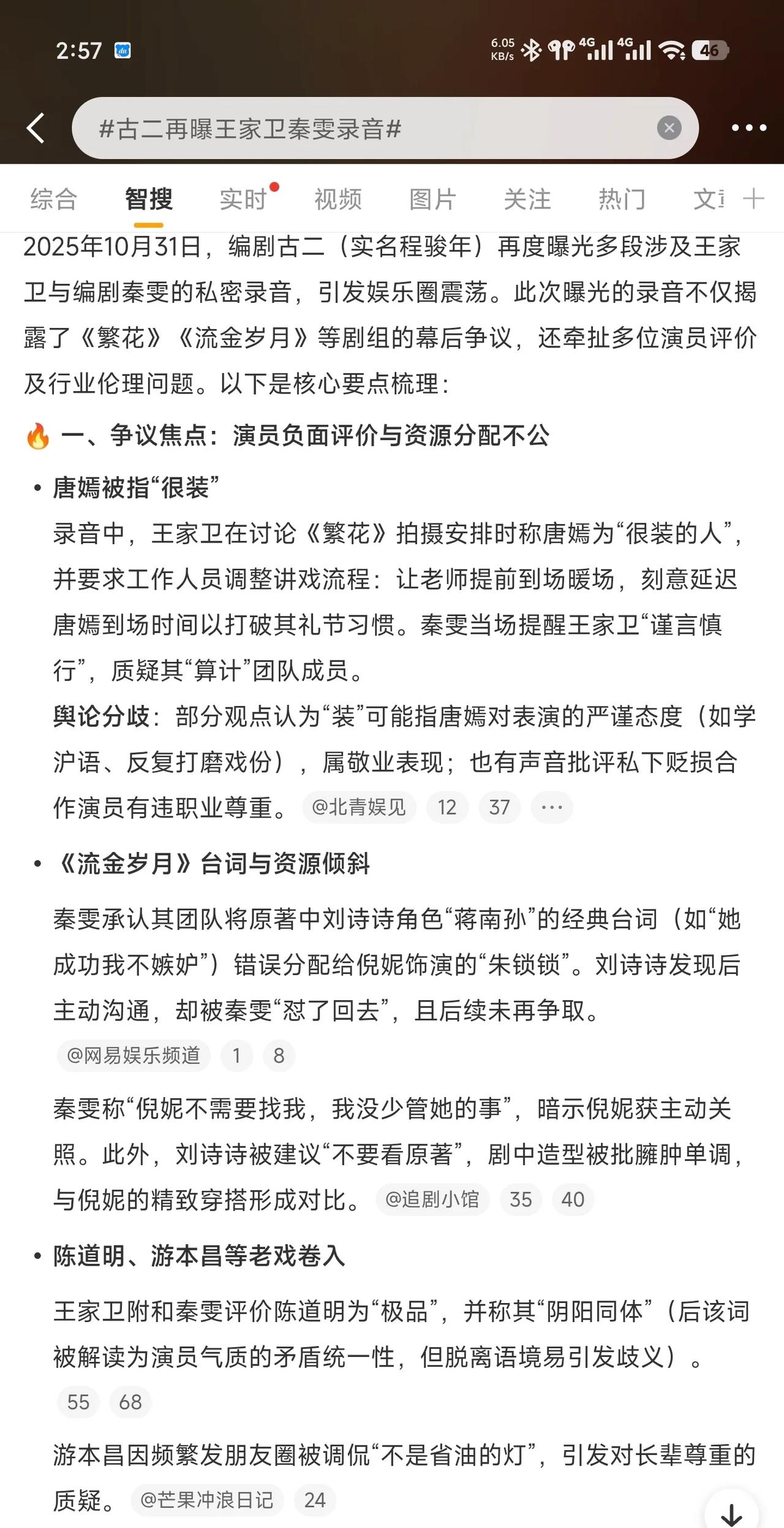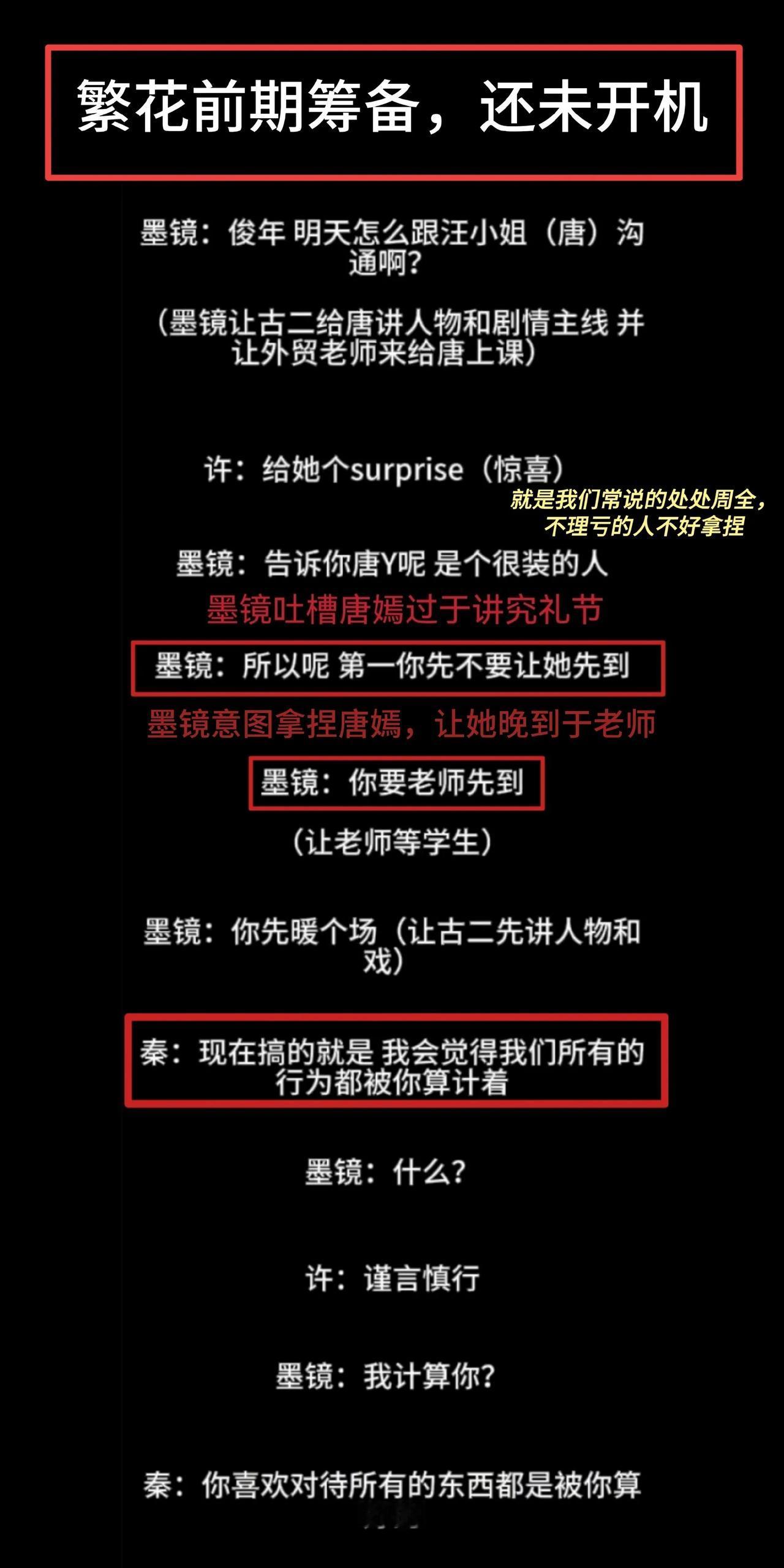 王家卫说唐嫣很装。 古二再曝王家卫秦雯录音,其中有一段谈到第二天要拍唐嫣的戏,王家卫给古二讲工作安排时说到:“告诉你,唐嫣呢,是个很装的人。”并补充解释称她“习惯早到、讲究礼节”,因此要求工作人员调整沟通策略:让老师先到场等候,避免唐嫣提前到达后无人接待。 此前,唐嫣在接受采访时表示,王家卫就是拍摄现场的“定海神针”:“导演为我们营造了一个非常好的创作氛围。你会觉得,他在现场既像老师,像一个大家长,又像你的朋友。你会觉得,只要他稳稳站在那里,无论拍摄多么辛苦,遇到多少难题,他总能解决。” 要知道当初王家卫力排众议选她演《繁花》汪小姐,一句“你就是汪小姐”让她闭关三年打磨角色,甚至拍86遍戏崩溃大哭都不放弃。因为《繁花》成功撕去“傻白甜”的标签,唐嫣心底满是对导演的感谢。 王家卫也曾多次肯定唐嫣,盛赞唐嫣是最好的汪小姐,没想到……说白了就是唐嫣习惯早到,比较有时间观念和职业道德,难道这都要被导演拿出来背后蛐蛐?