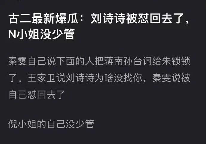 为什么这么欺负刘诗诗? 古二再曝王家卫秦雯录音里,秦雯说因为戏份怼了刘诗诗。男