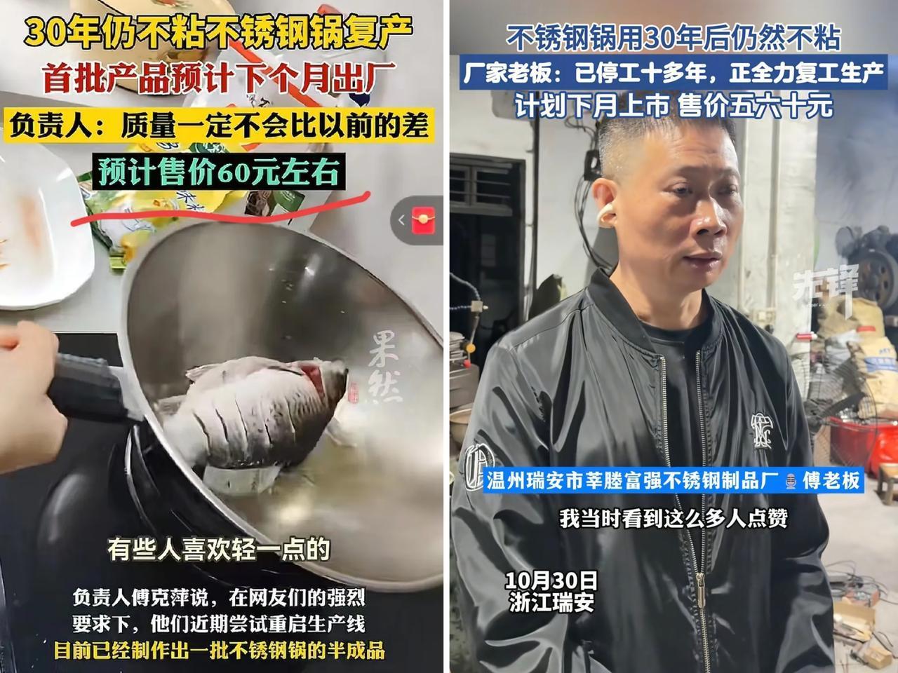 瑞安铁锅的老板太“傻”了! 那款能扛30年的老牌不粘锅,被他 重启生产了,定价一出来更是惊掉下巴——只要60块。 换别的商家,这种口碑爆品不得炒到一两百? 可这位老板倒好,网友提意见希望锅别太重,老板也虚心接受,承诺会在以前基础上改进,还保证跟以前一样好用。 在如今物价飞涨的时代,几十年不涨价,这老板简直是一股清流。 他这么做,不是傻,而是把消费者放在了首位! 为这样的好老板👍,祝他生意大爆!
