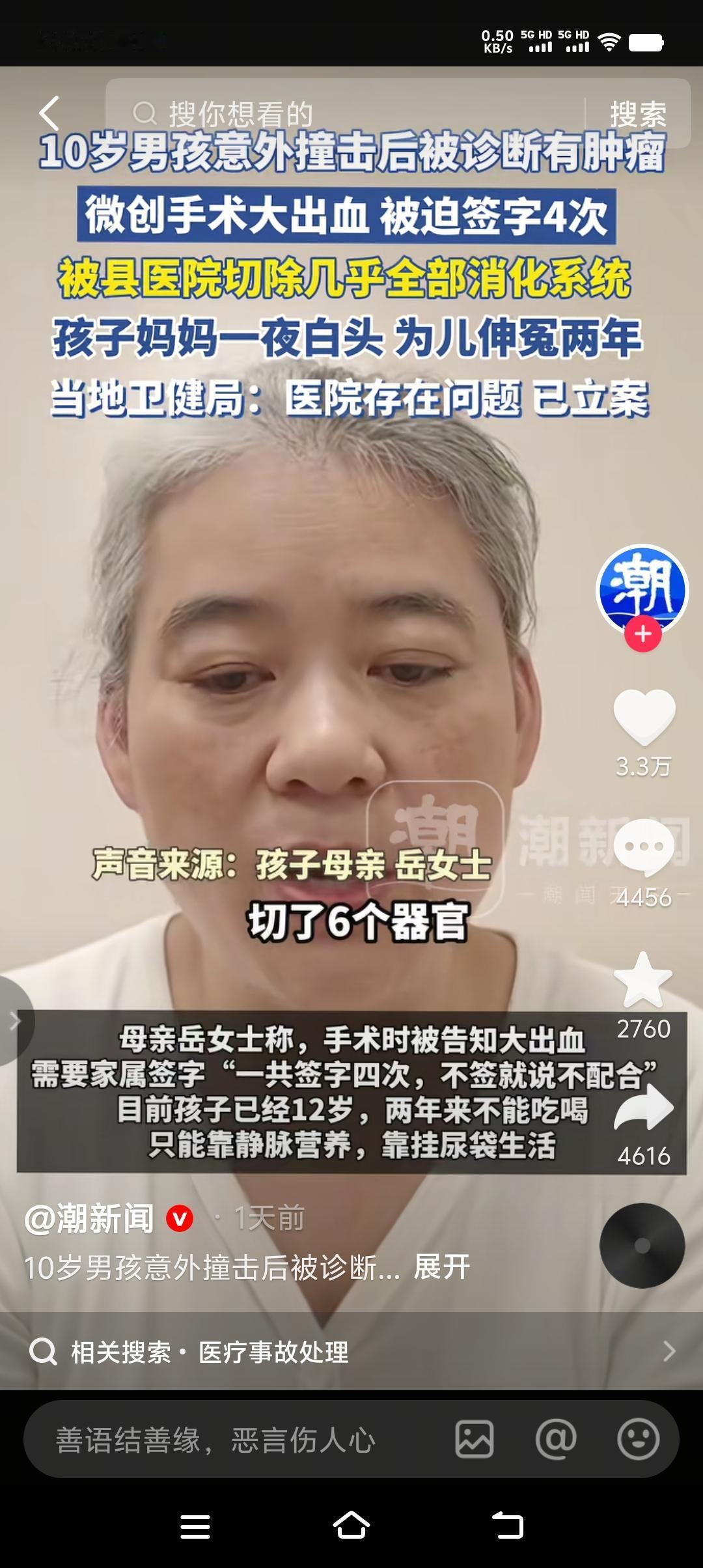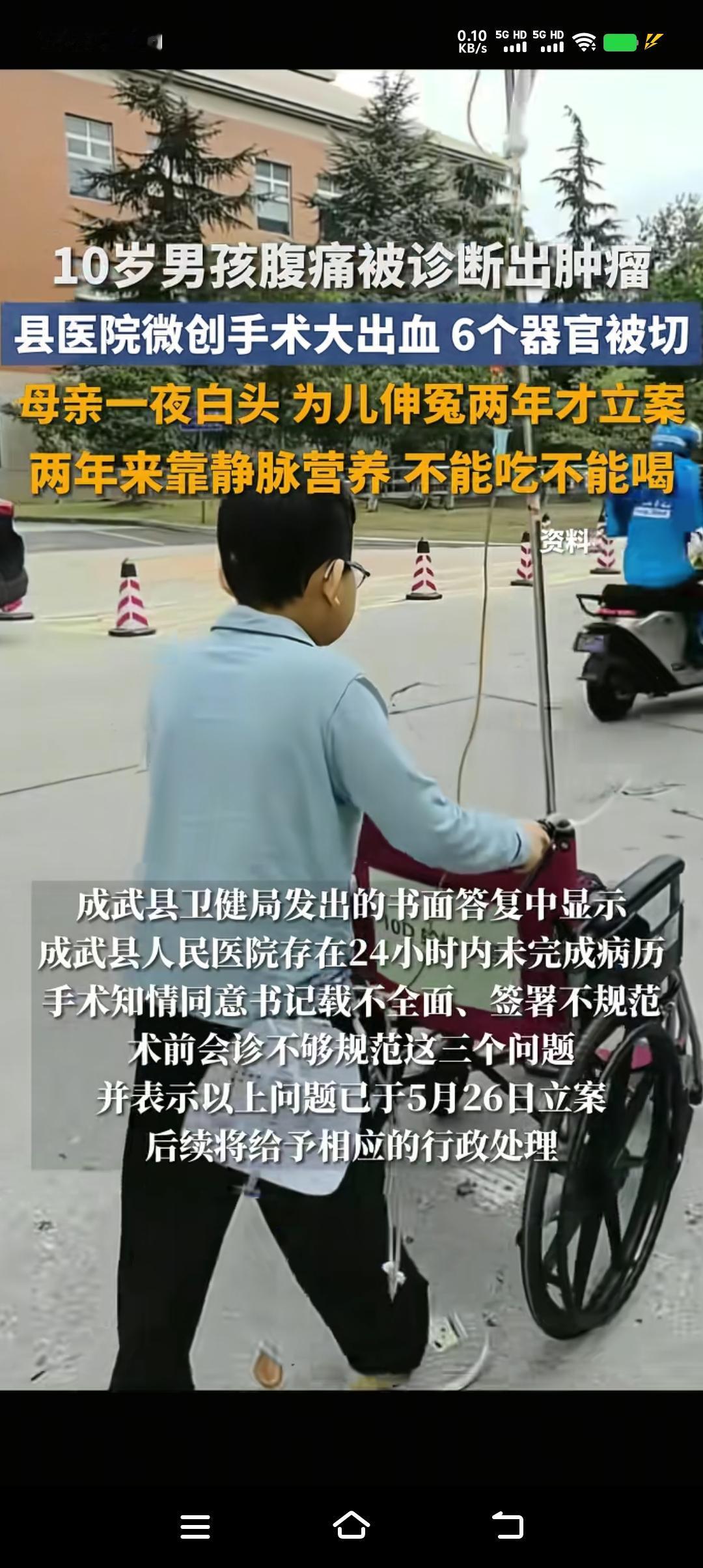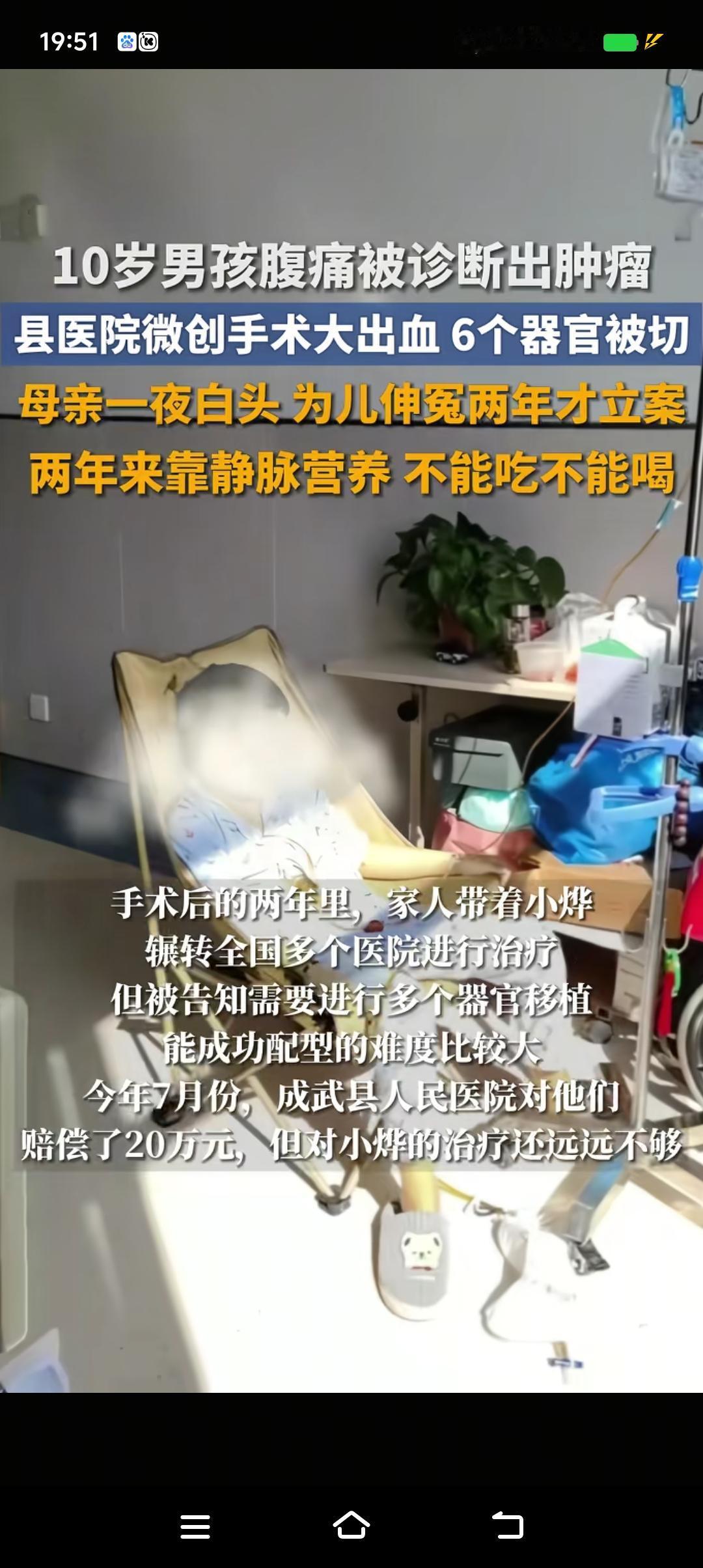 微创手术最后做成了清创手术,10岁男孩的腹腔几乎全部清干净,十二指肠、小肠、胰腺、胆囊全切、胃切了2/3,结肠剩了不到50厘米,可以说是整个消化吸收器官基本全无。无法像正常人吃饭喝水,只能长期靠静脉注射营养液活着。 一个一个的坏消息,一次一次的手术临时签字,医生在手术中的每一步,都好像在弥补前面的错误。历经14个小时的手术,进去好好的一个人,等到出来时腹腔器官几乎全被掏空了。 后续治疗还需要移植多个器官,但是面临三个问题,一个是配型成功不容易,二是移植后需要终身服药,三是需要巨额的医药费。该切的也切,不该切的也切,实在让人无法想象躺在手术台上的还是人吗?