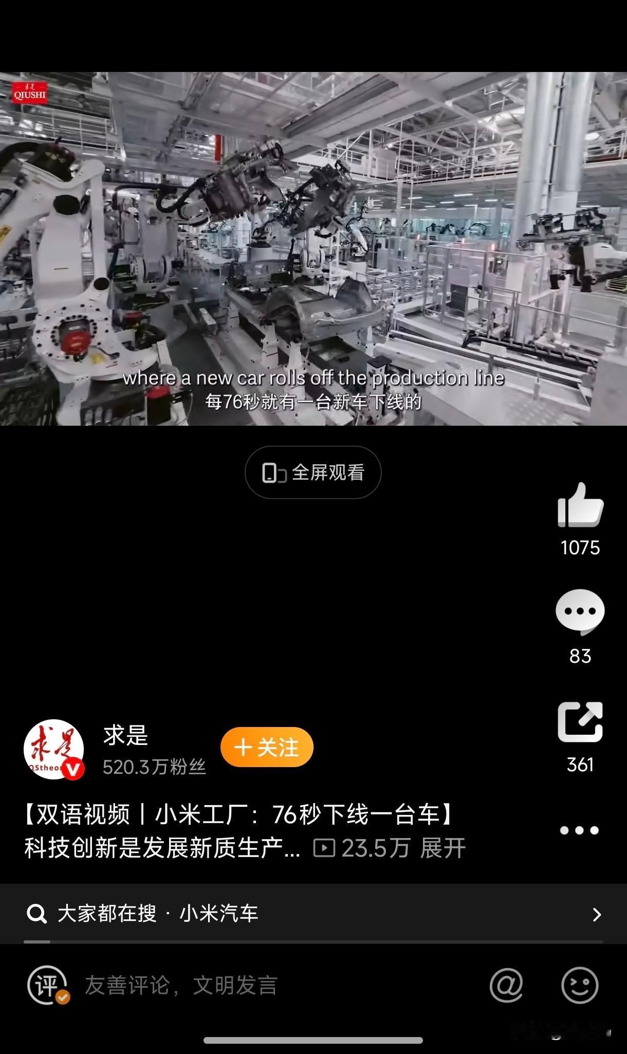 财经媒体刮起的那一阵“妖风”,被国家级媒体狠狠地抽散了。 看看求是怎么说?“小米代表新生产力”,“新质生产力是推动高质量发展的关键密码”,“每76秒一台新车下线!小米汽车超级工厂用科技重新定义“中国速度””。等等等等啊! 求是是什么等级的媒体,不用我说了吧?而且,这篇小米的报道采用了是双语,含金量有多大,自己去掂量掂量吧! 当黑子们还在嘲讽小米没技术、组装厂的时候,求是、央视、人民日报却一次次的站在小米背后,支持小米,中国制造业向智能化、高端化迈进,需要的是小米这样的实干家,而不是键盘上的批判家。