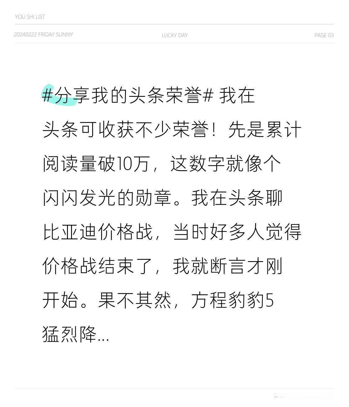 我在头条可收获不少荣誉!先是累计阅读量破10万,这数字就像个闪闪发光的勋章。我在头条聊比亚迪价格战,当时好多人觉得价格战结束了,我就断言才刚开始。果不其然,方程豹豹5猛烈降价,目标直指坦克品牌。比亚迪混动换代、纯电有新动作,导致销量难突破,这一降价指向明确,重新规划中高端品牌、后续车型价格下探等。 另外,我还获得“妙笔生花”称号。一开始把头条当“文字日记本”,记录日常点滴,没想到被大家记住。这称号是鼓励,我会继续写生活里的小确幸和感悟。