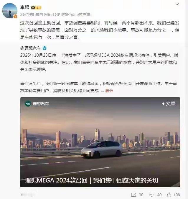 理想汽车CEO李想转发理想MEGA2024款召回声明并表示:这次召回是主动召回。事故调查需要时间,有时候一两个月都出不来。我们已经发现了导致事故的隐患,面对万分之一的风险我们不能等。事故可能是万分之一,但是生命只有一次,是百分之百。