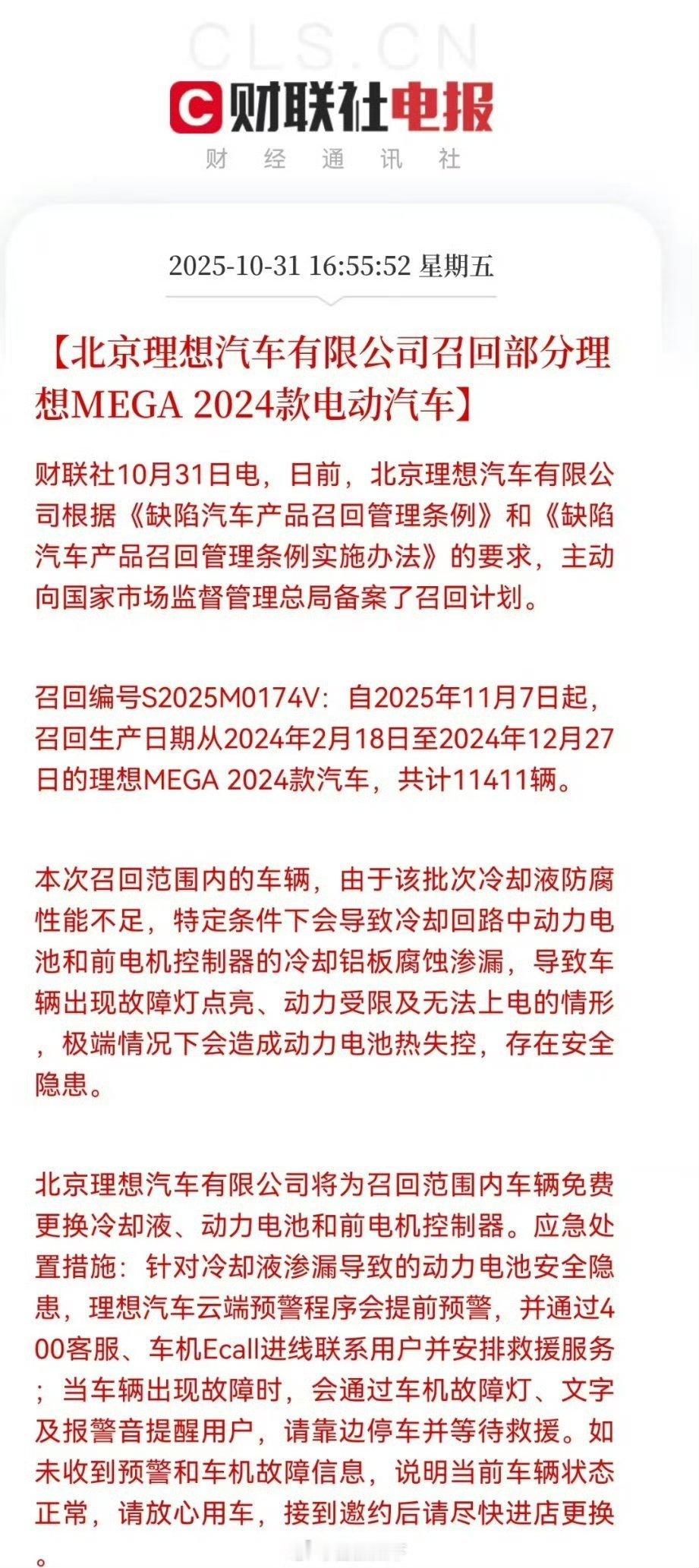 北京理想汽车有限公司召回11411辆MEGA 2024款电动汽车,生产日期从2024年2月18日至2024年12月27日,本次召回范围内的车辆,由于该批次冷却液防腐性能不足,特定条件下会导致冷却回路中动力电池和前电机控制器的冷却铝板腐蚀渗漏,导致车辆出现故障灯点亮、动力受限及无法上电的情形,极端情况下会造成动力电池热失控,存在安全隐患。