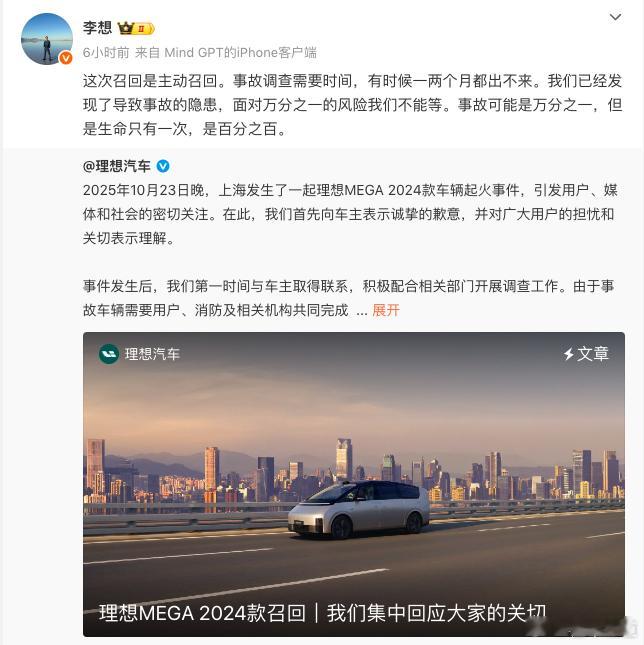 懂车之道讯 懂车之道快讯,针对10月23日上海一辆MEGA街头自燃的事件,今天理想汽车进行了回应。理想汽车决定实施主动召回,并表示“理想汽车希望今后确保所有车型不再发生自燃事故”。理想汽车CEO也回应了此次召回。