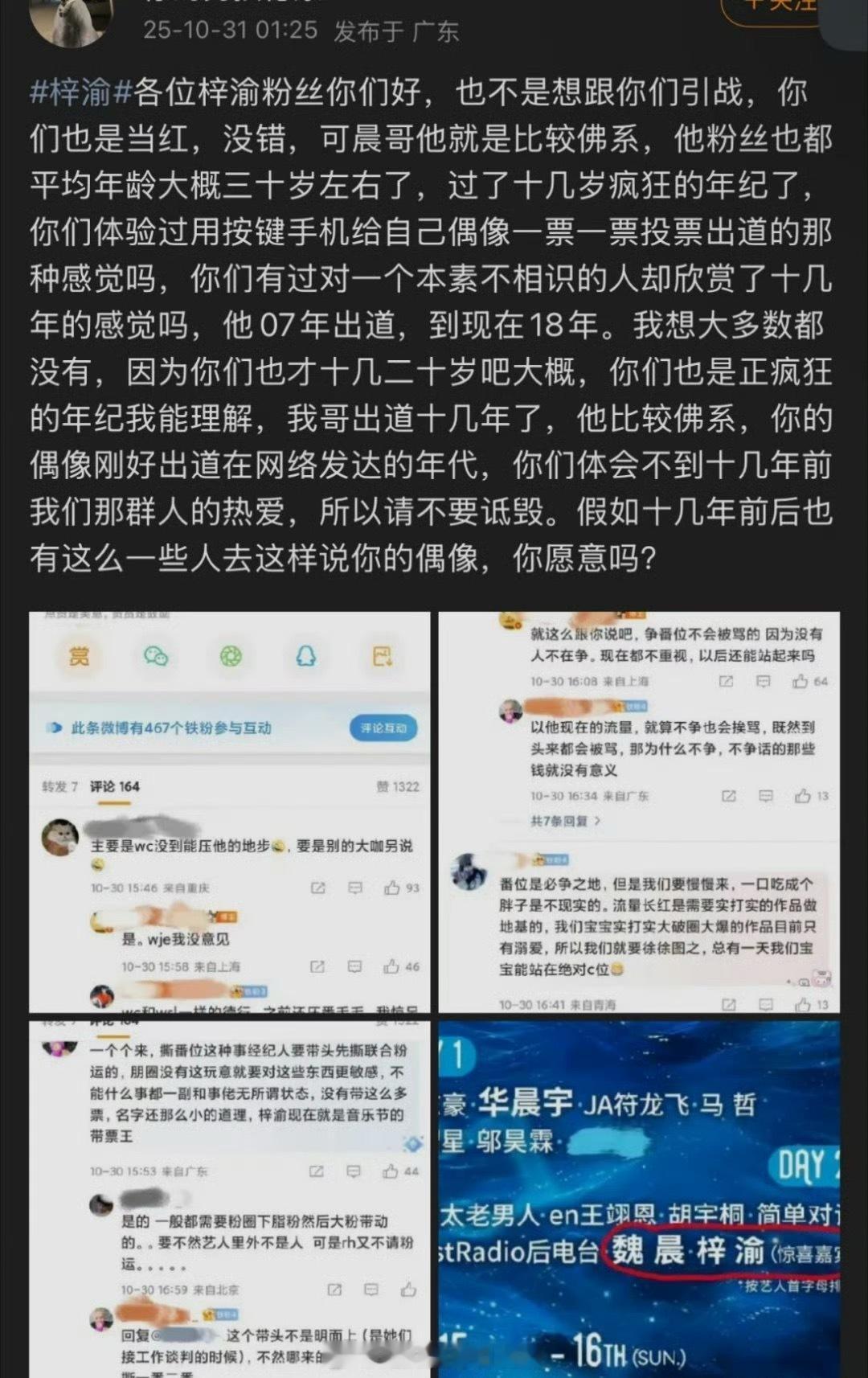 梓渝粉丝因为音乐节海报上的魏晨名字在前且字体更大而不满,现在魏晨粉丝发文回应了,好体面……