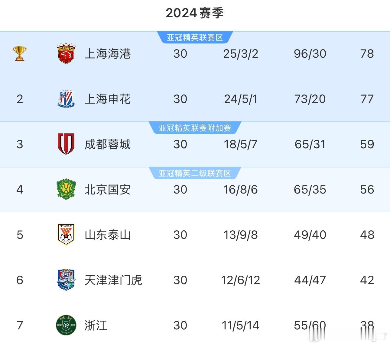 截止到今晚,前七排名和去年的大结局一模一样。海港申花中超争冠成都蓉城无缘争冠中超