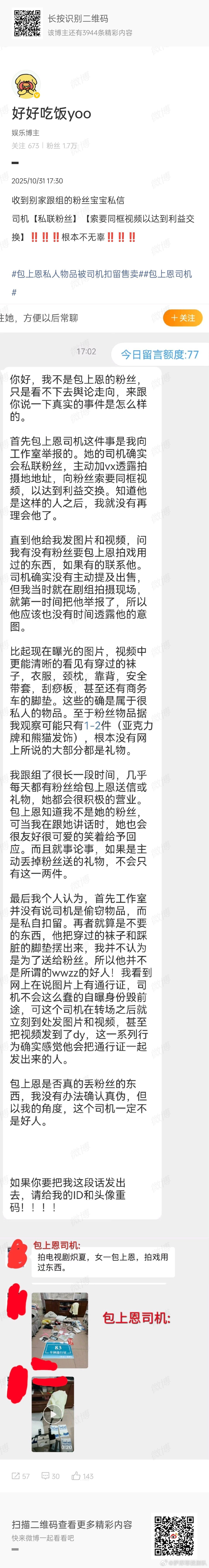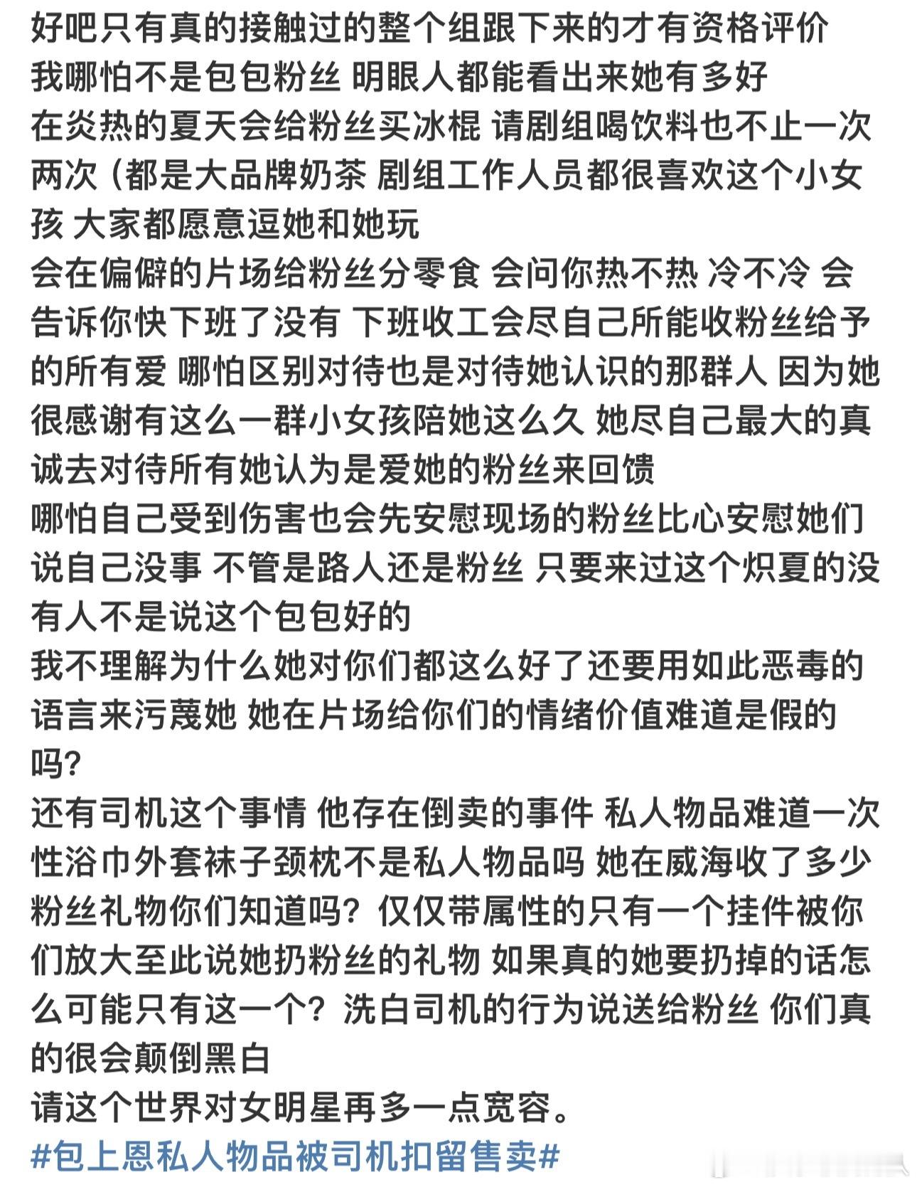 非粉都觉得包上恩很好 有个博主发评论,说非粉都知道包上恩线下对粉丝特别好,夏天不吃一次两次请剧组/粉丝喝奶茶。聊天两次就记住人下次笑眯眯打招呼。上午收到粉丝的纸条“帮忙选晚饭吃啥”晚上下班后会指着粉丝说吃烤肉。片场太远了粉丝有时候吃不到饭包上恩会让助理带零食给粉丝… 非粉为包上恩发声 包上恩粉丝为司机发声