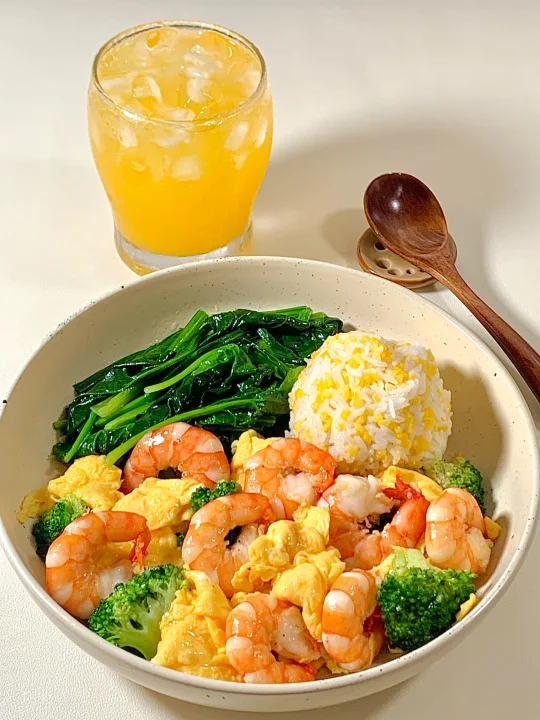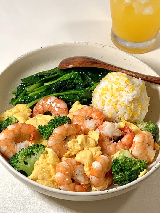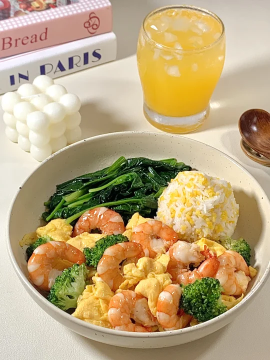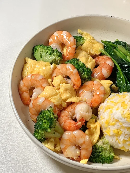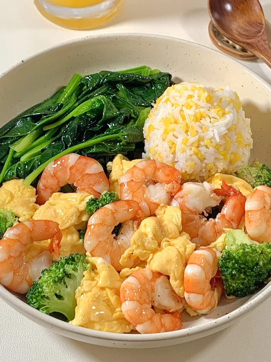 今日减脂餐虾仁炒鸡蛋!巨鲜美😋 📝食材:虾仁、鸡蛋、西兰花、菠菜 ✨步骤: [飞吻R]虾仁去壳+黑胡椒盐腌制10分钟 1️⃣水开放 西兰花焯水1分钟→菠菜焯水1分钟 2️⃣锅里喷油两个鸡蛋炒熟备用 3️⃣起锅烧油虾仁煎熟→加入鸡蛋→加入焯好的西兰花 4️⃣炒匀加入盐和鸡精调味即可出锅啦~ 🍃装盘开吃啦~😋 (附玉米饭比例) 📝玉米与大米按1:2的比例电饭煲焖熟~