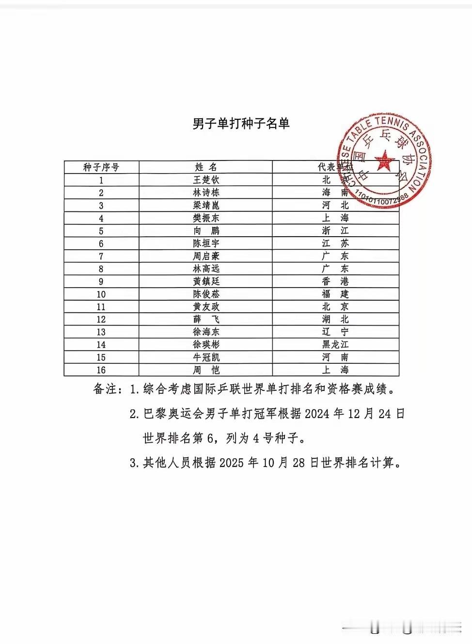 第十五届全国运动会乒乓球项目决赛种子及参赛名单公示: 【男单】王楚钦、林诗栋、梁靖崑、樊振东位列前四号种子 【女单】孙颖莎、王曼昱、陈幸同、陈梦位列前四号种子 【混双】黄镇廷/杜凯琹、袁励岑/王艺迪、陈垣宇/蒯曼、林高远/刘诗雯位列前四号种子 巴黎奥运会单打冠军樊振东和陈梦都是4号种子位! 11月7日-20日在中国澳门举行的全运会真的要来了,期待乒坛大战!