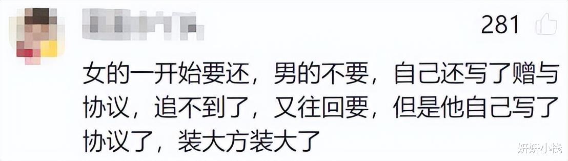 有网友表示,女方一开始说要把钱还上,男方却坚决不收,还专门写了个赠与协议。