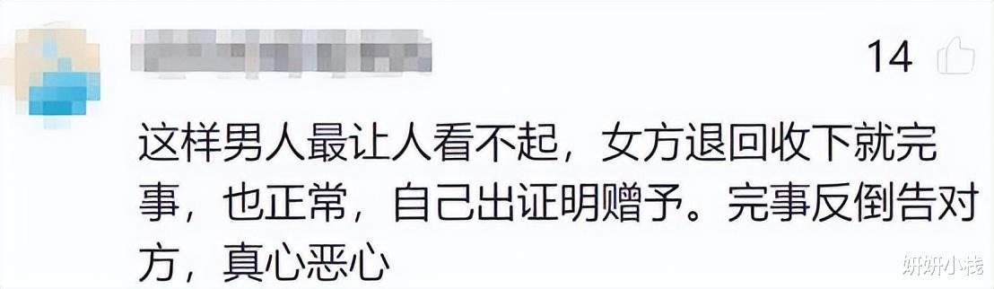 另一些网友的看法是,这种男人真让人瞧不起!女方主动退钱,男方就该收下,多正常。他倒是出个证明说这是赠与,后来却反咬一口,真恶心人!
