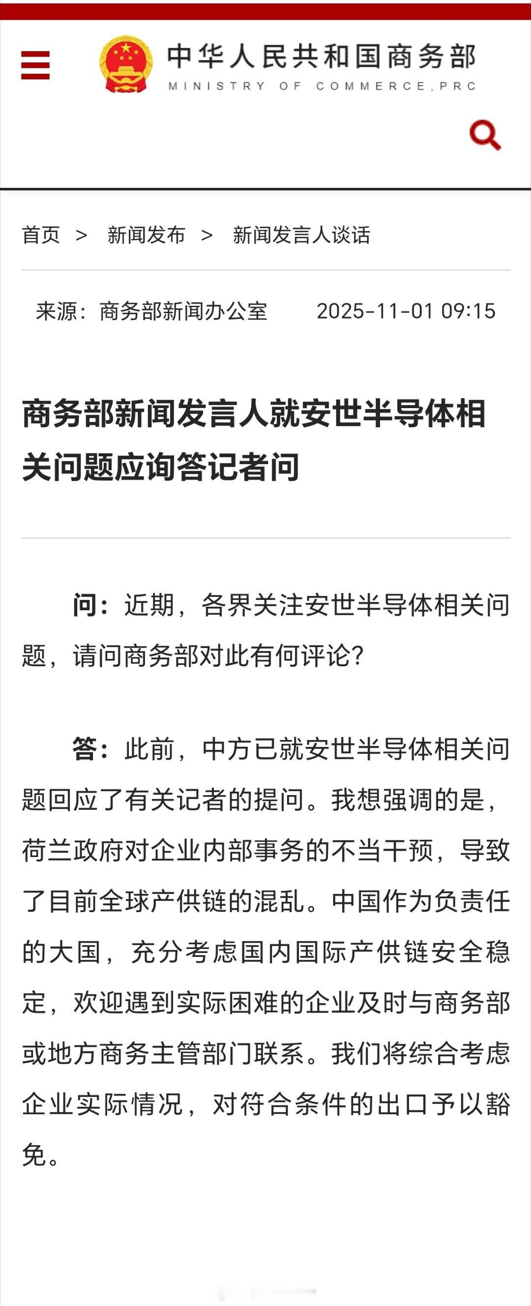 荷兰政府不当干预致全球产供链混乱商务部回应安世半导体问题将对商务部回应安世半导体相关问题:将对符合条件的出口予以豁免