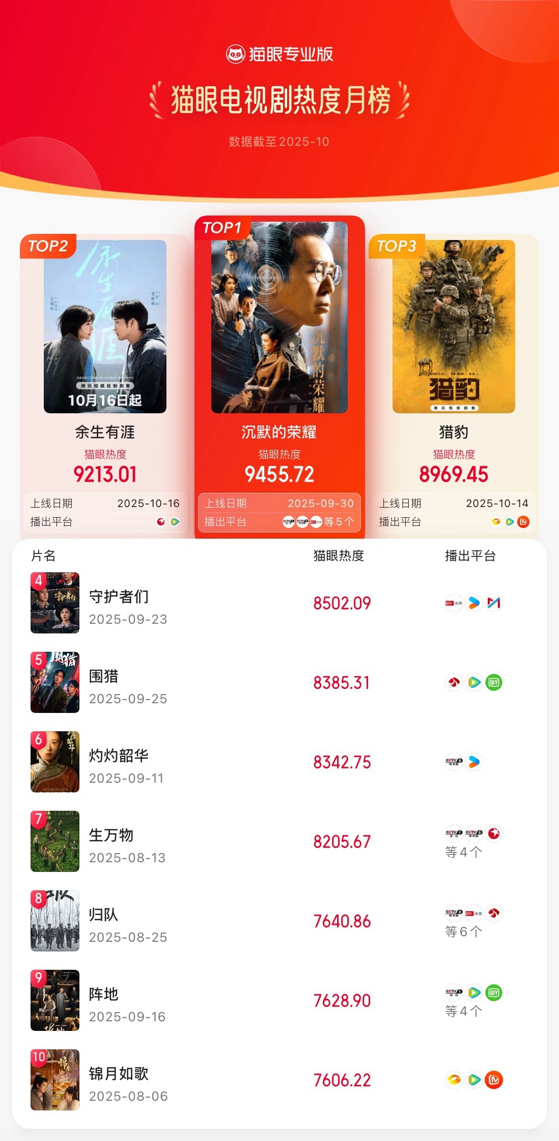 猫眼专业版2025年10月猫眼电视剧热度榜