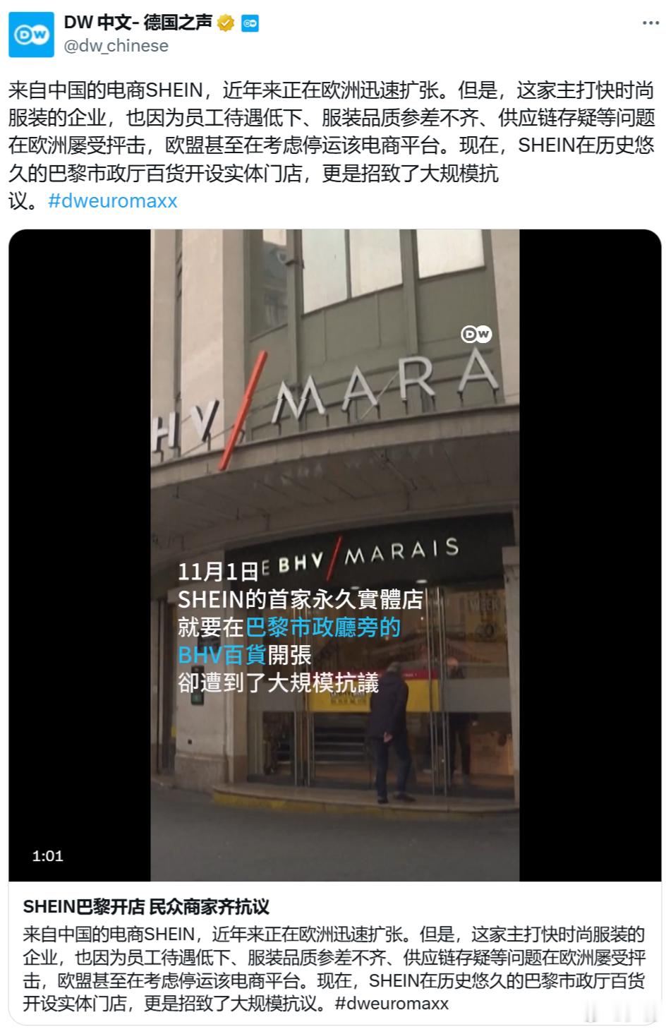 来自中国的电商SHEIN,近年来正在欧洲迅速扩张。但是,这家主打快时尚服装的企业,也因为员工待遇低下、服装品质参差不齐、供应链存疑等问题在欧洲屡受抨击,欧盟甚至在考虑停运该电商平台。现在,SHEIN在历史悠久的巴黎市政厅百货开设实体门店,更是招致了大规模抗议。