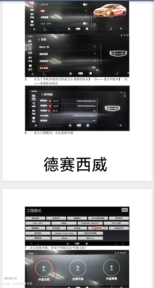 帝豪S,25年9月车机系统更新包 帝豪S车机分为北斗星通和德赛西威两家。 目前两种车机出现的导航及日历问题在新的更新包中已全部解决。 如何区分,我自己是看关于本机里的MCU版本,数字X.XX_开头的是北斗星通的,这个车机比较开放,很容易解开限制安装app。 0FE7B_开头的是德赛西威,这个车机要安装其它app需要电脑和公对公的usb线。 上面两个配图是厂家不同车机系统升级的指导文档,里面除了MCU不同,进入工程模式的方法也不同,也是一种区分方式。 但厂家给的升级文档里,确实写了让4s通过obd诊断仪读取设备号来判定。
