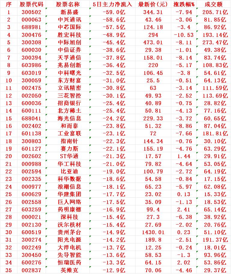 本周,整个市场“主力资金净流出的”35个股汇总 新易盛:5日主力净流出 59.0亿元,累计跌幅 -7.94% 中兴通讯:5日主力净流出 58.6亿元,累计跌幅 -3.06% 中芯国际:5日主力净流出 57.5亿元,累计跌幅 -3.40% 胜宏科技:5日主力净流出 48.9亿元,累计跌幅 -10.53% 中际旭创:5日主力净流出 45.4亿元,累计跌幅 -8.11% 中信证券:5日主力净流出 38.6亿元,累计跌幅 -1.01% 天孚通信:5日主力净流出 37.8亿元,累计跌幅 -8.14% 兆易创新:5日主力净流出 36.4亿元,累计跌幅 -5.17% 中科曙光:5日主力净流出 32.5亿元,累计跌幅 -3.80% 东方财富:5日主力净流出 31.0亿元,累计跌幅 -0.51%