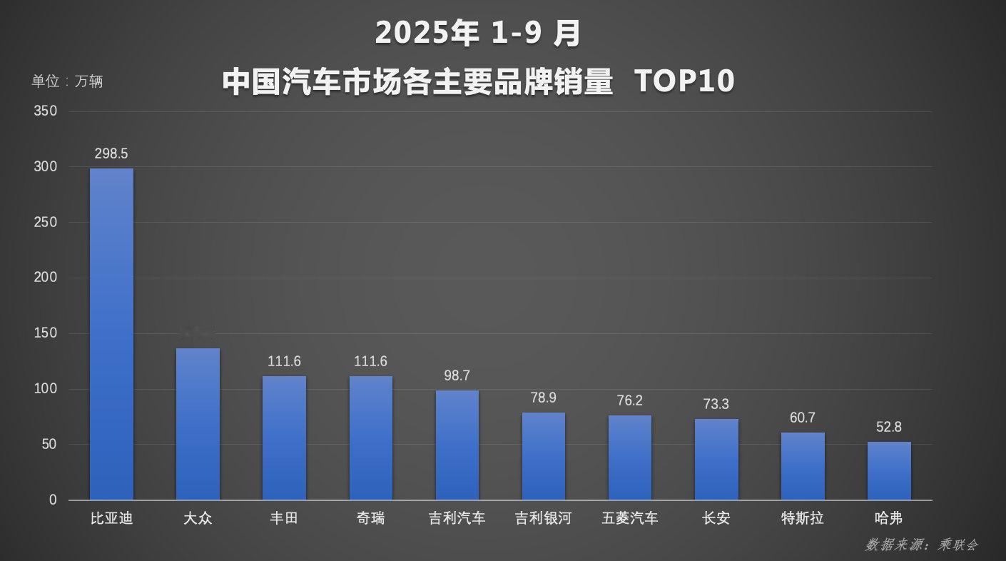 其中,比亚迪汽车(王朝丨海洋)品牌9月销量达35.6万辆,1–9月累计销量298.5万辆,在全市场单一品牌销量排名中稳居冠军,持续巩固头部地位。