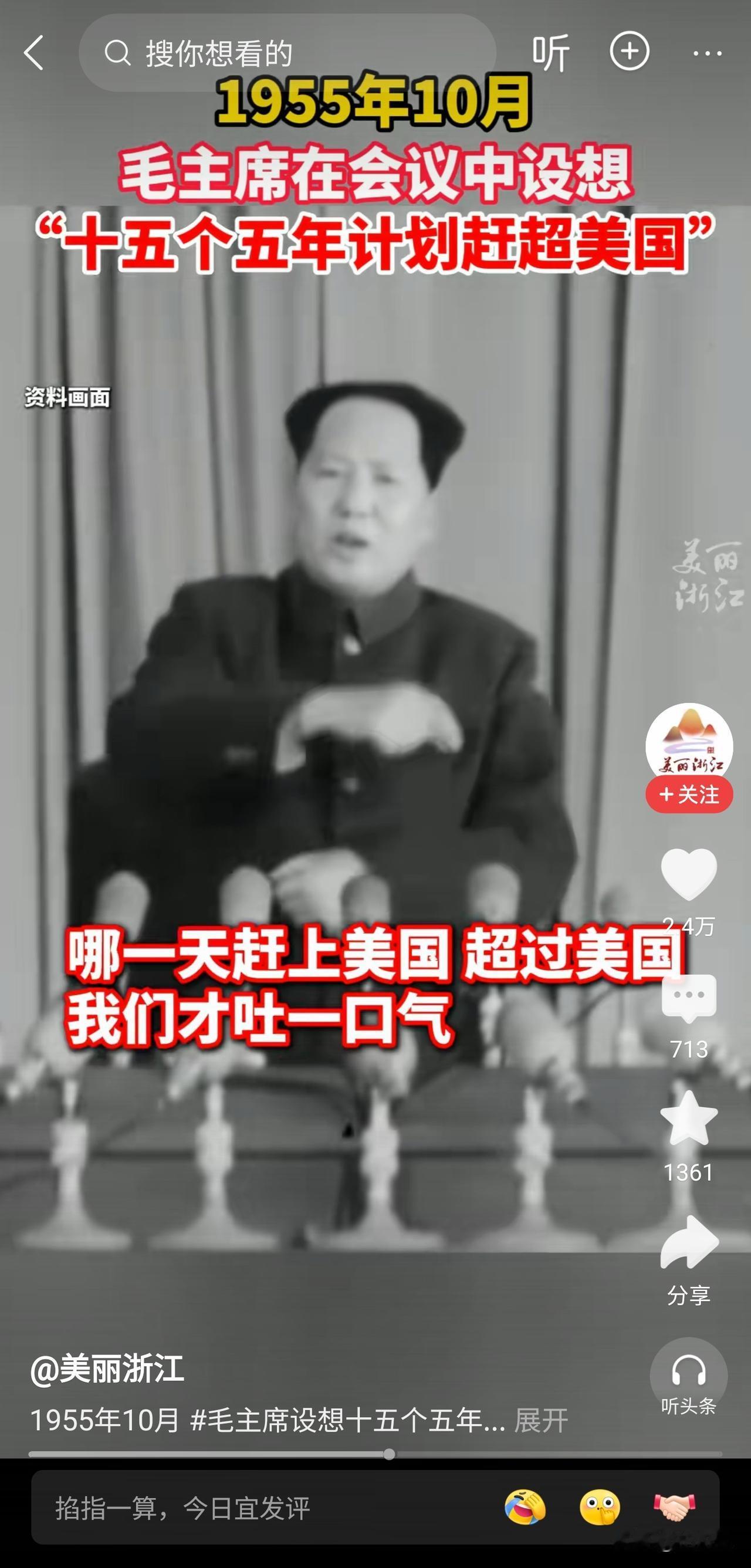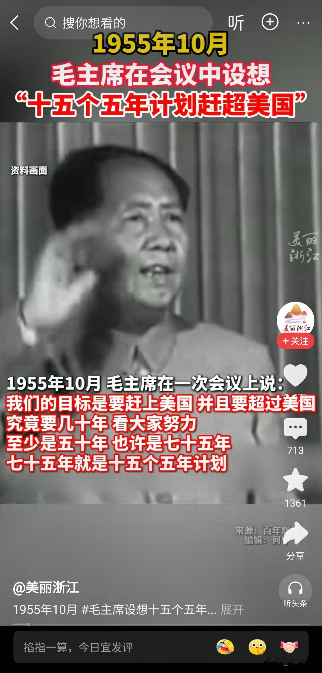 毛主席曾经在会议上说,我们的目标是要赶上美国甚至超过美国,我们要用多少年呢?至少是五十年,五十年不够的话那就七十五年,七十五年就是十五个五年计划,什么时候赶上美国超过美国,我们才能吐一口气。 今年是十四五计划收官之年,也过去七十多年了,中国现在在很多领域已经赶上美国或超过美国成为世界前例了,我们中国人终于可以吐一口气了,但是我们还是要继续下个五年计划,在毛主席期望的十五个五年计划里再继续完成中国的各项发展,让中国早日完成复兴。