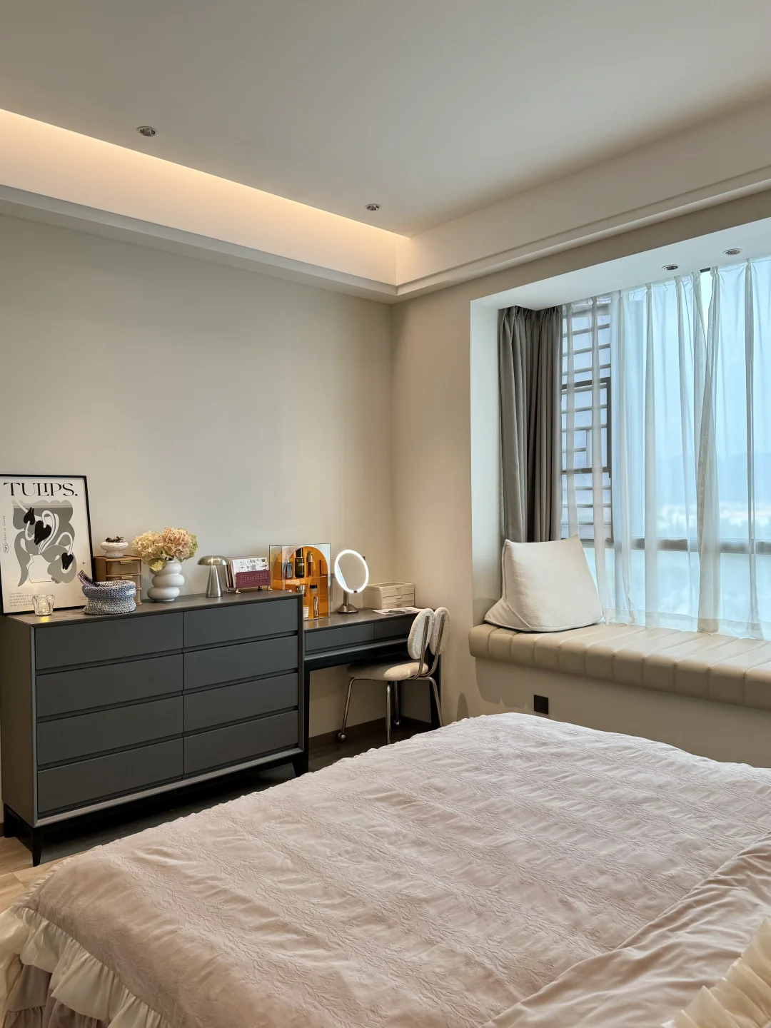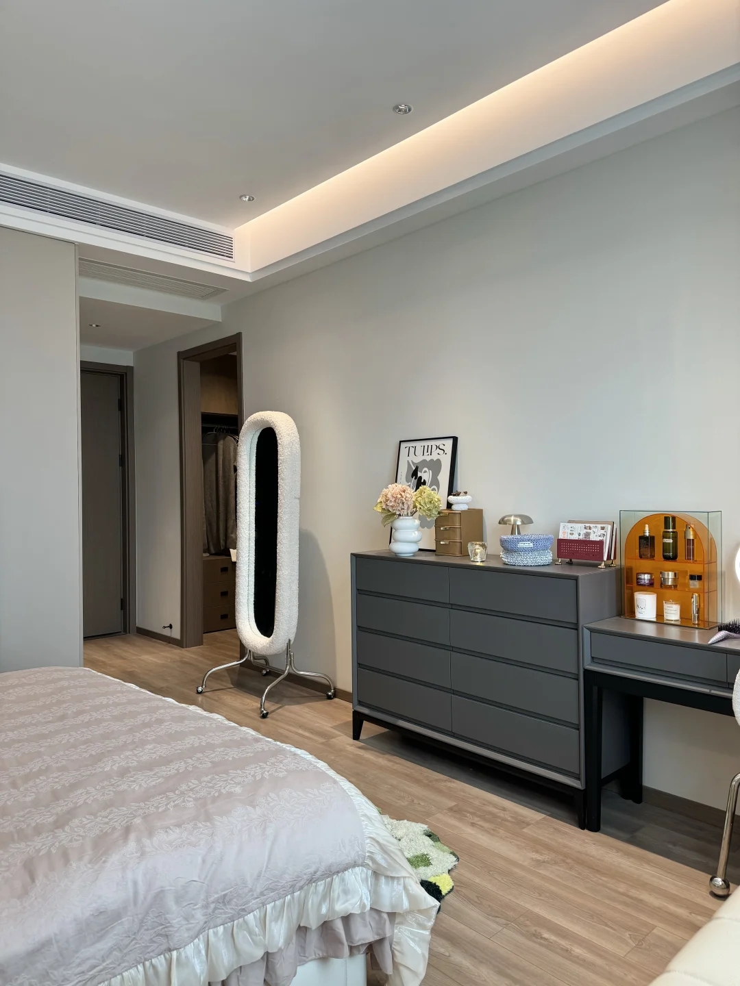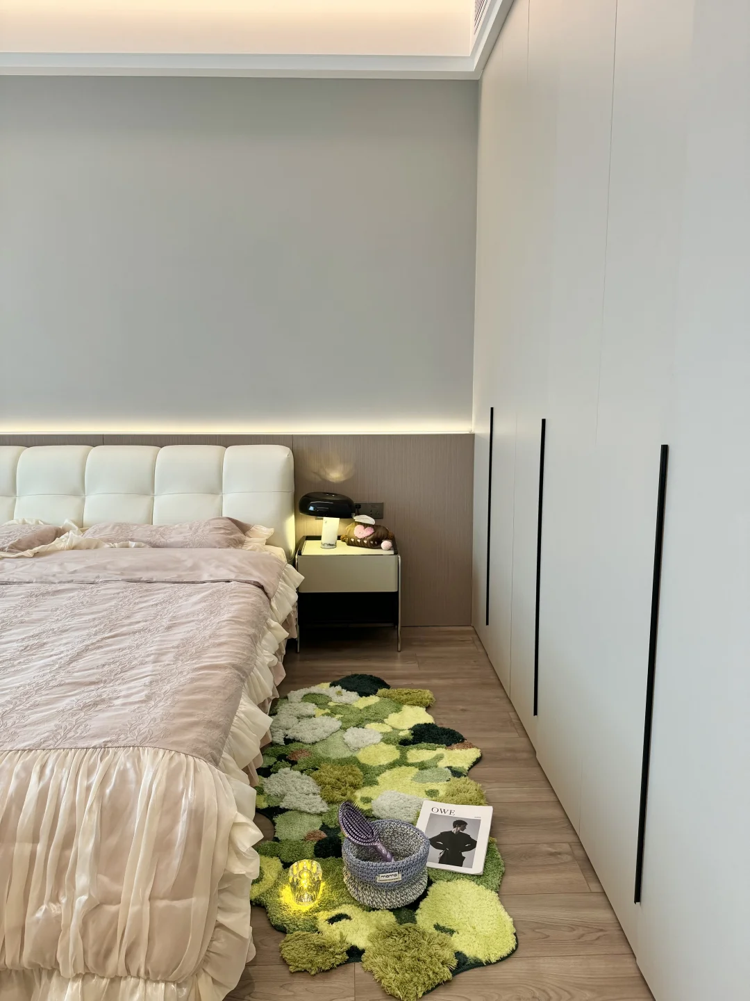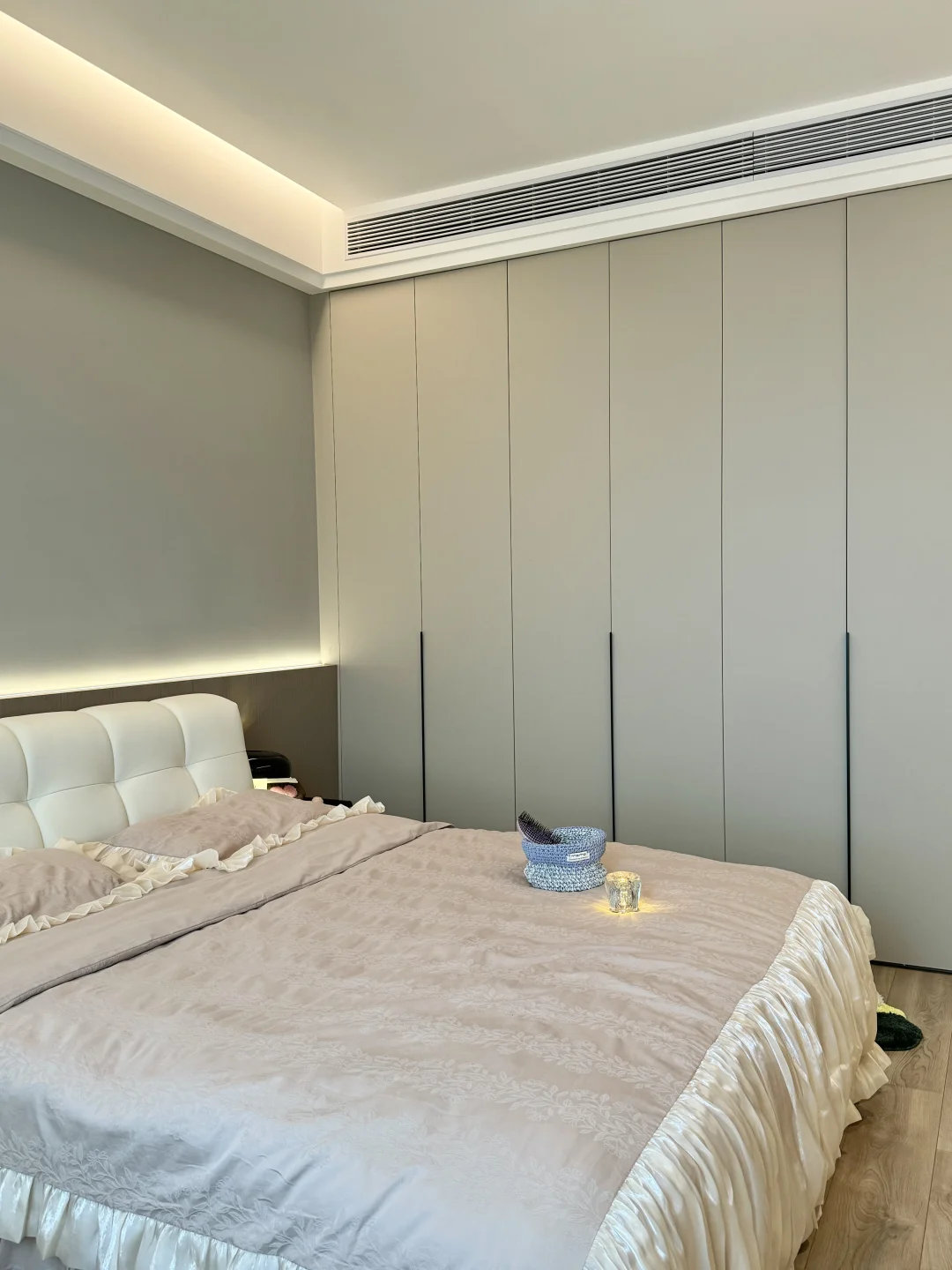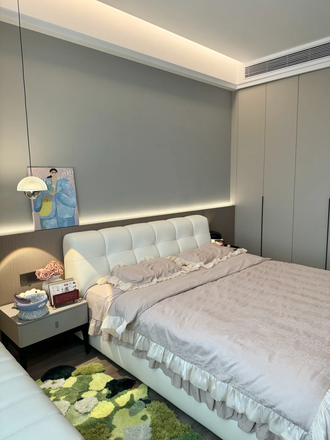 入秋后的卧室布置后太温柔了,这大概就是女孩子想要的氛围感卧室吧🧸 主卧套间共21平,有主卫有小衣帽间 没有复杂的设计,现代极简风格 平顶吊四周一圈双眼皮边吊 墙面刷了乳胶漆,衣柜门一门到顶 床头半墙背景墙内嵌灯带,氛围感满满的~ 这种天气就应该一头扎进被窝里 舒舒服服的睡一觉☁️~