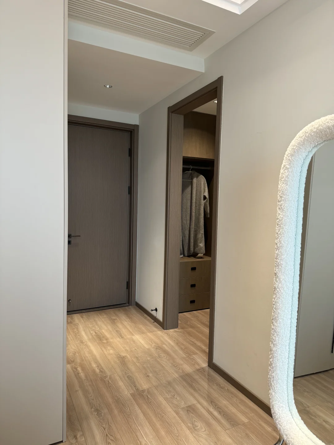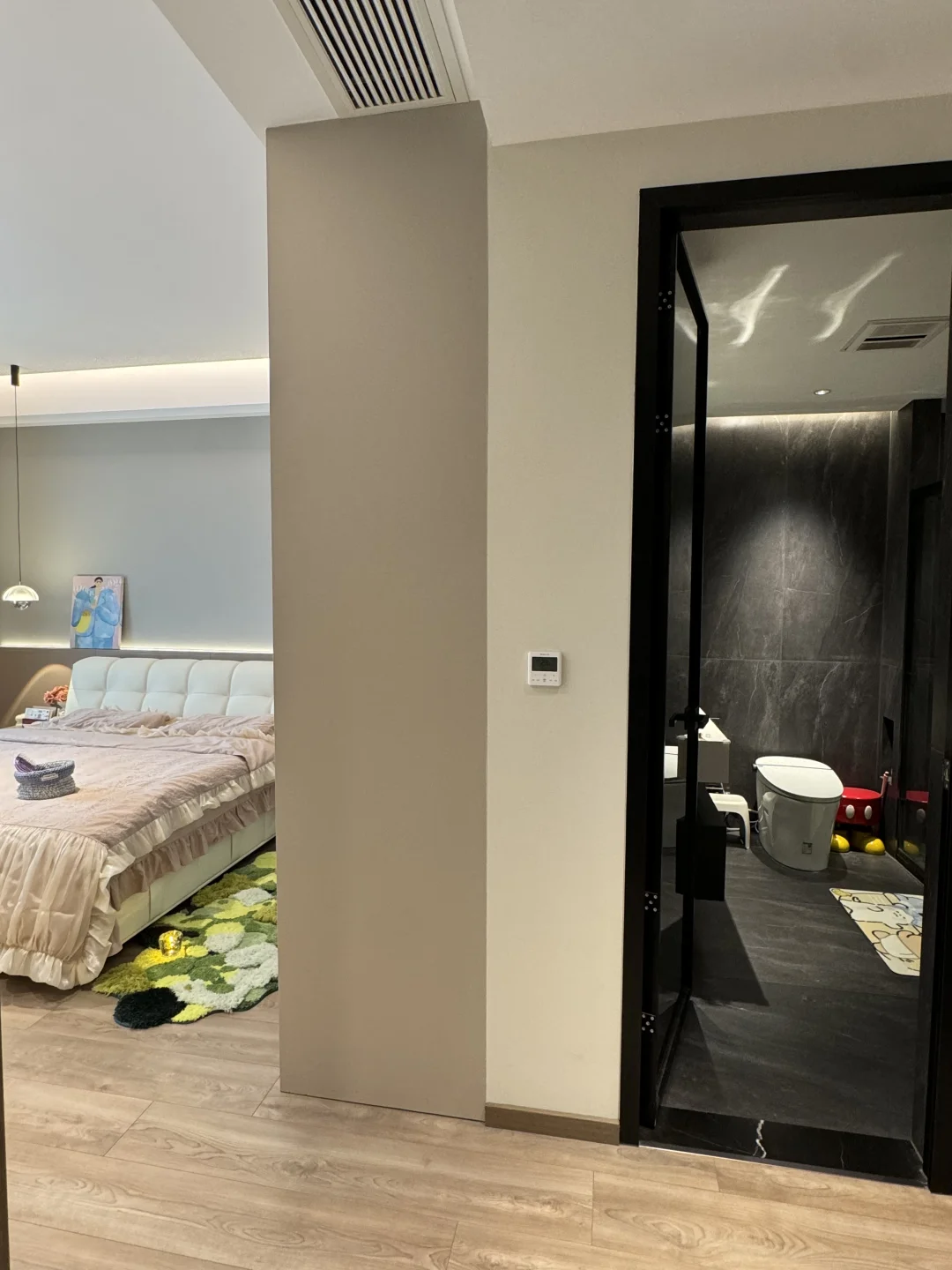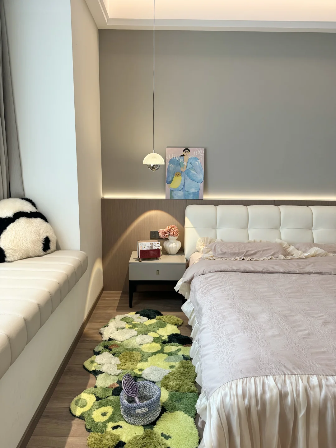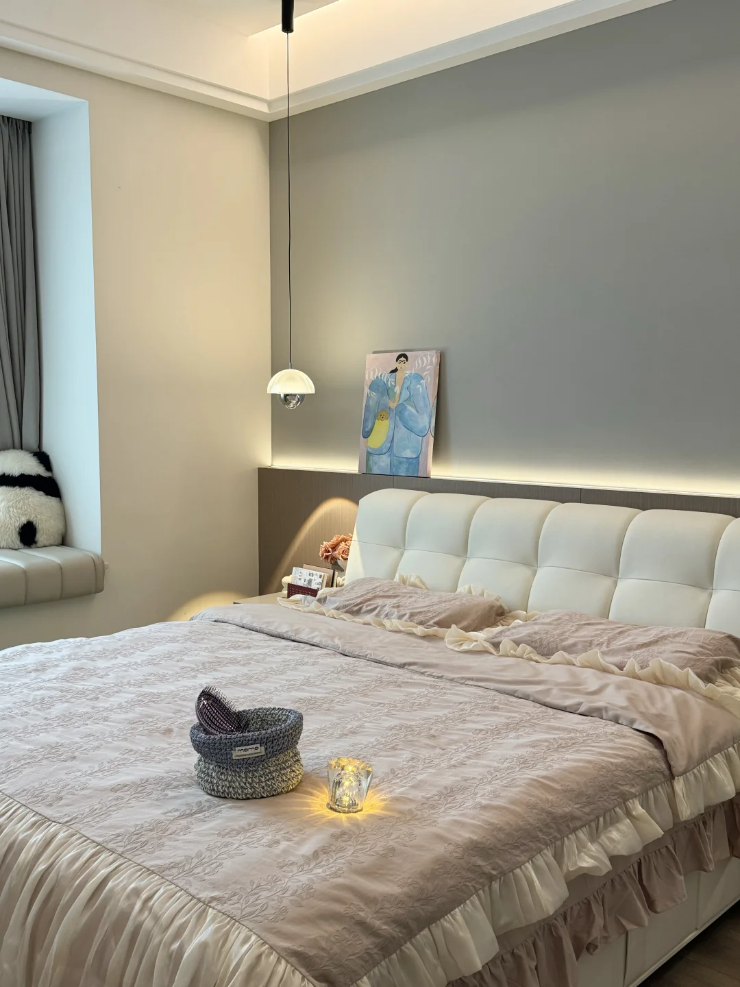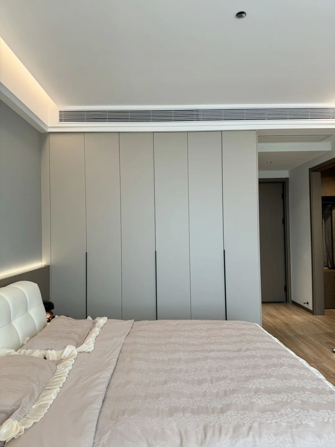 入秋后的卧室布置后太温柔了,这大概就是女孩子想要的氛围感卧室吧🧸 主卧套间共21平,有主卫有小衣帽间 没有复杂的设计,现代极简风格 平顶吊四周一圈双眼皮边吊 墙面刷了乳胶漆,衣柜门一门到顶 床头半墙背景墙内嵌灯带,氛围感满满的~ 这种天气就应该一头扎进被窝里 舒舒服服的睡一觉☁️~