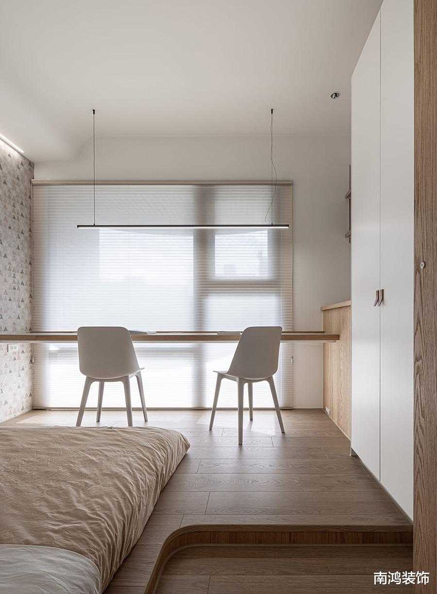 如果是次卧做书房,我们可以将书桌与地台床结合起来,形成一体式设计,视觉流畅度极佳!