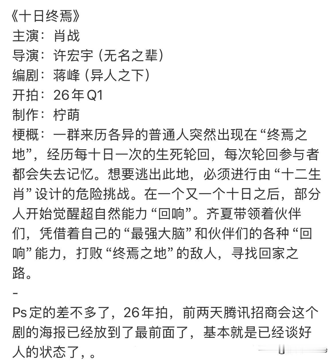 11月1日,肖战《十日终焉》班底阵容出炉! 肖战一番,尹昉二番,徐正溪三番,胡连