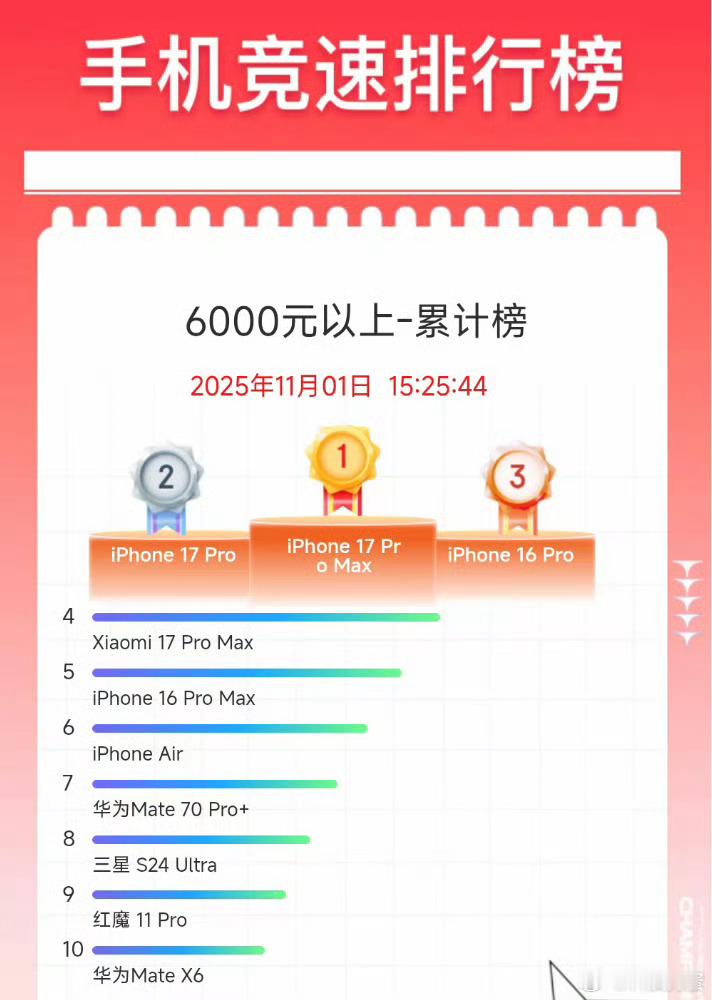 在6000+价位段,小米17Pro Max销量排名第四,很明显小米的高端化战略的成功。“两强争霸”格局也开始变得明朗。