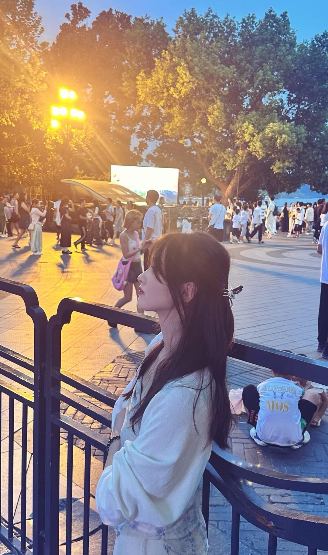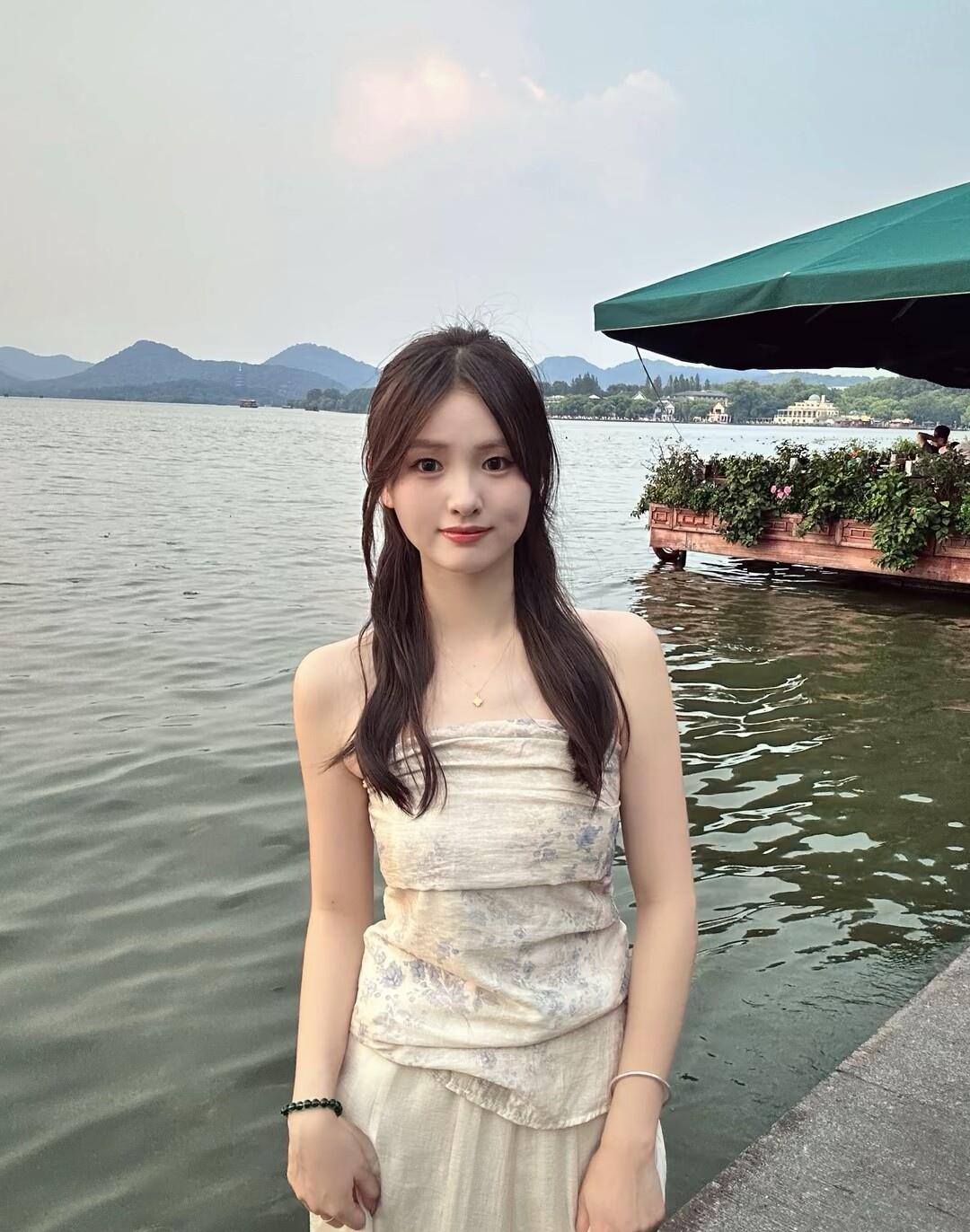 在湖边轻抚发丝,感受自然的宁静与美好。
