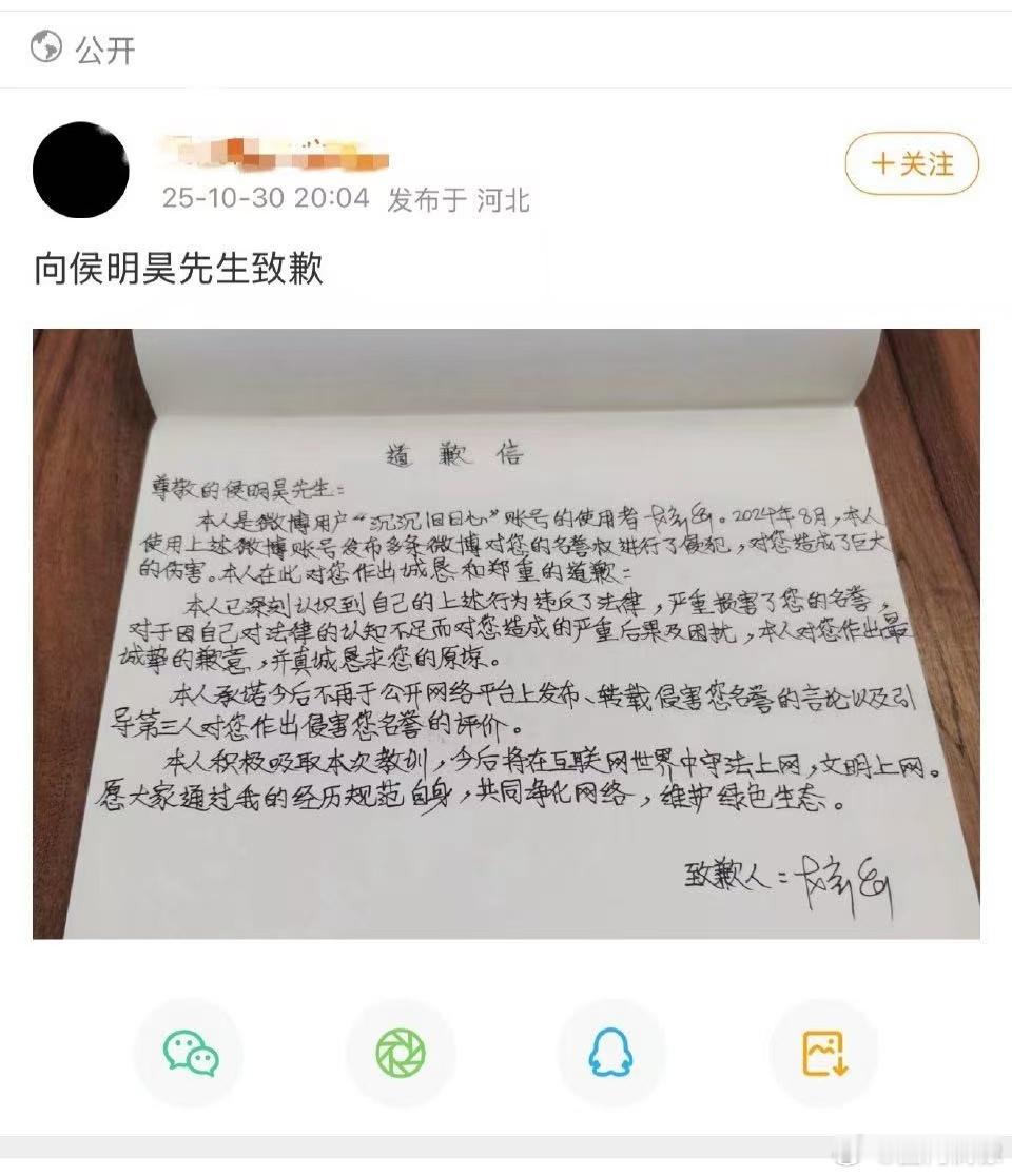 侯明昊告黑胜诉 恭喜帅哥维权成功!针对豆瓣、微博等平台的侵权言行,工作室果断取证起诉,如今首案胜诉,用法律划清了网络言论的边界。对致歉者准许缓期支付赔偿金,更显法理之外的温度。其他案件仍在推进,期待清朗网络环境,更等新作品上线!侯明昊黑粉手写道歉信