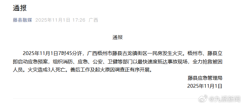 【#广西通报一民房火灾致3死#】广西藤县应急管理局11月1日通报:2025年11月1日7时45分许,广西梧州市藤县古龙镇街区一民房发生火灾。梧州市、藤县立即启动应急预案,组织消防、应急、公安、卫健等部门以最快速度抵达事故现场,全力抢救被困人员。火灾造成3人死亡。善后工作及起火原因调查正有序开展。